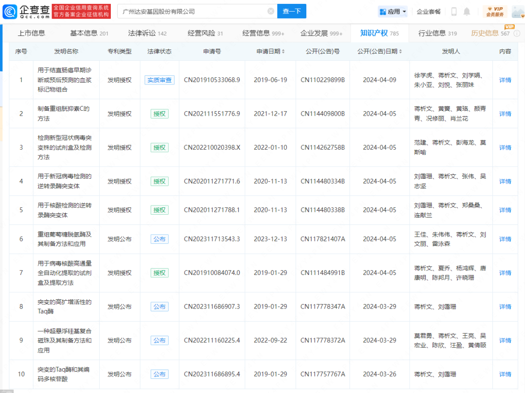 说到分子诊断,有两家企业值得深入研究和分析,一家是达安基因,一家是圣湘生物。达安基因在国内做分子诊断比较早,不仅在分子诊断领域的产品比较齐全,也逐渐向生化免疫、微生物等方向做扩展,其销售渠道和特殊背景的原因,让达安成为分子诊断赛道上的领导者。而圣湘生物作为后起之秀,凭借精湛的技术和对客户需求的深度洞察,抓住了一个又一个的风口,不仅在国内的分子诊断市场挥斥方遒,也将中国的分子诊断方案带向了全球,走向了世界。这两家公司的发展路径并不相同,但在却在顶端相聚,成了中国分子诊断界的“临床PCR双子星”! 从达安基因最近一年获批的技术专利来看,主要聚焦在酶、磁珠、提取、核苷酸、蛋白等试剂原料方面的技术创新和突破,可见技术创新的尽头是做出好的原料,做出好的产品。 据企查查数据显示,达安基因的专利信息达到418条,在一众IVD企业遥遥领先。