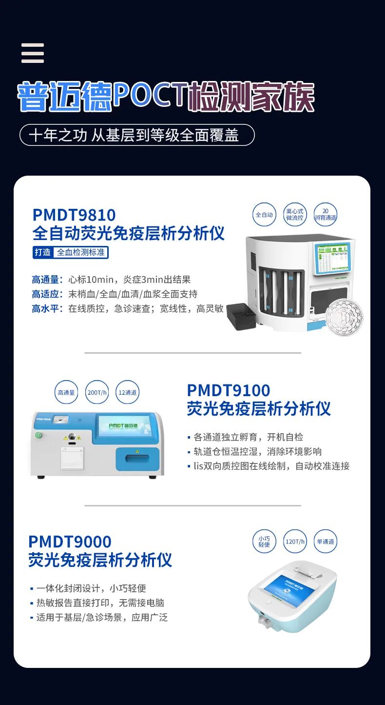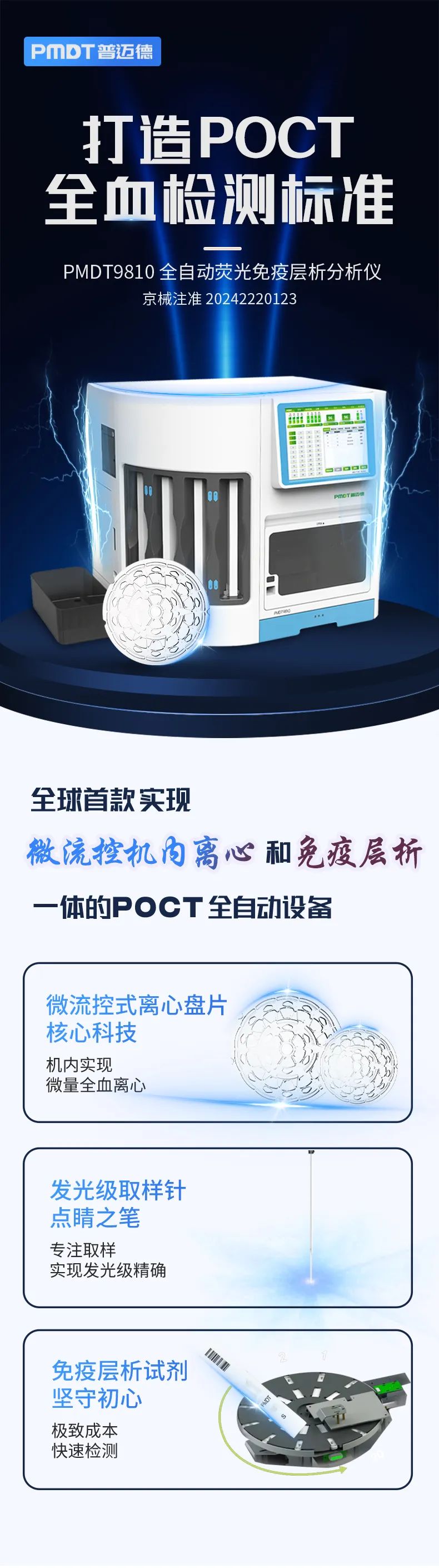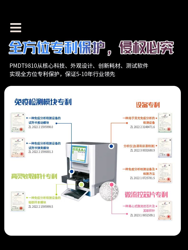 为全球首款实现“微流控机内离心”和“免疫层析”一体的全自动设备——PMDT9810全自动荧光免疫层析分析仪。