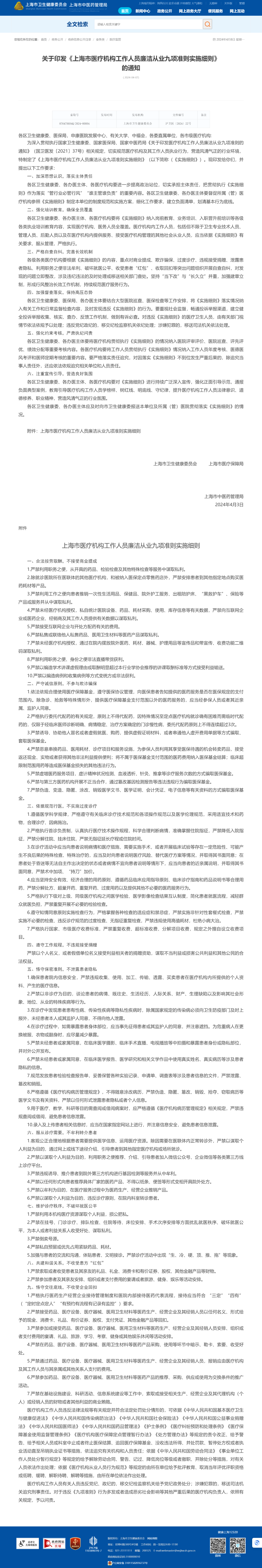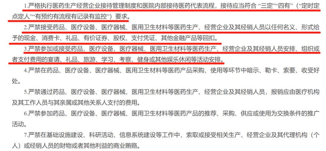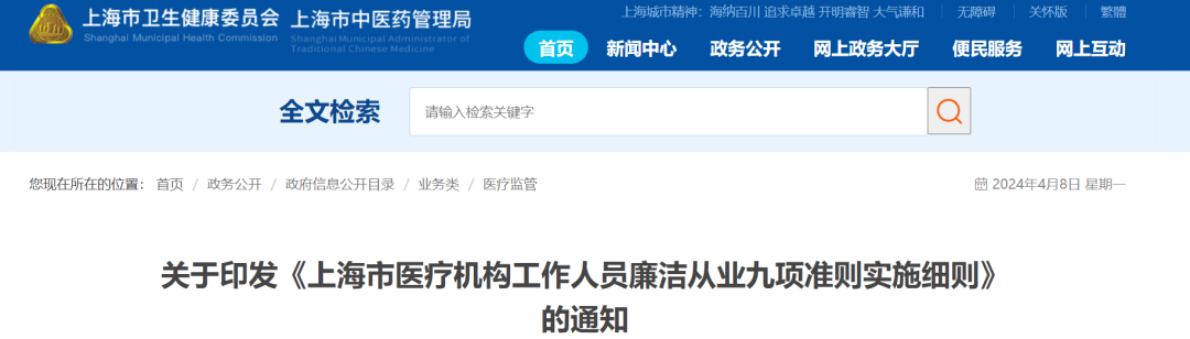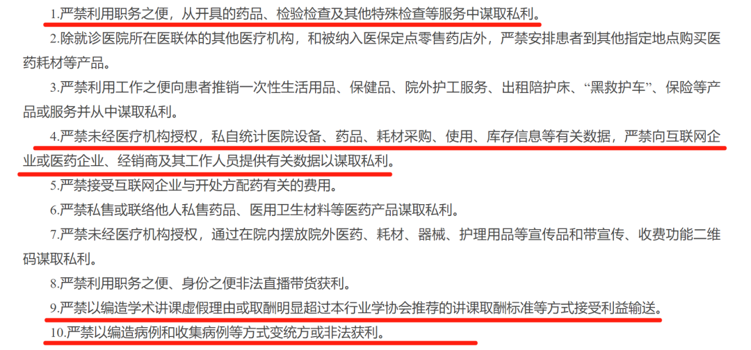 | 最新准则出台,涉及商业提成、欺诈骗保、回扣等一系列院内禁令。 4月7日,上海卫健委发布《上海市医疗机构工作人员廉洁从业九项准则实施细则》(完整附文末)。全文一共提到54处“严禁”,对医疗机构相关人员的执业行为进行详细要求。 严禁接受药品、医疗设备、医疗器械、医用卫生材料等医药生产、经营企业及其经销人员以任何名义、形式给予的现金、消费卡、礼品、有价证券、股权、支付凭证、其他金融产品等回扣。严禁参加或接受药品、医疗设备、医疗器械、医用卫生材料等医药生产、经营企业及其经销人员安排、组织或者支付费用的宴请、礼品、旅游、学习、考察、健身或其他娱乐休闲等活动安排。回扣问题系医药领域的多年顽疾,近年相应的监管与惩处均在持续加强。 除了上海,近期重庆、河南、新疆等多地均了发布严查药械回扣的相关文件,各类大型医院巡查也将“收受企业回扣”列为重点之一。作为药械流通的关键一环,医药代表也成为监管的重要对象。《细则》中提到:严格执行医药生产经营企业接待管理制度和医院内部接待医药代表流程,接待应当符合 “三定”“四有”(“定时定点定人”“有预约有流程有记录有监控”)要求。从各地通报来看,已有多名医药代表因回扣问题而接受法律惩处,且随着监管体系完善,追责链条正在不断延长。根据湖北省药监局《关于进一步加强药品购销领域不正之风治理工作的通知》,其中提到:向国家工作人员行贿的,对企业法定代表人、主要负责人、直接负责人的主管人员和其他负责人终身禁止从事药品生产经营活动。聚焦商业提成,点名讲课费、统方严禁利用职务之便,从开具的药品、检验检查及其他特殊检查等服务中谋取私利;严禁以编造学术讲课虚假理由或取酬明显超过本行业学协会推荐的讲课取酬标准等方式接受利益输送;严禁以编造病例和收集病例等方式变统方或非法获利等。近年来,商业提成方式呈现出隐蔽化发展,监管手段也逐步细化。以“讲课费”为例,新疆生产建设兵团卫健委发布的《兵团医疗机构及其工作人员廉洁从业九项准则实施细则(试行)》明确提出,按照《关于医务人员学术讲课取酬的工作提示》要求,严格执行医务人员学术讲课取酬 “六个应当”和参与学术讲课“六个严禁”。去年7月,广西开展了不合理取酬专项清退工作,要求医务人员主动清退2018年至2023年5月以来所收受的讲课费、培训费、研讨费等不合理报酬。商业统方也在医疗反腐推进中被多次提到,对于药械企业而言,掌握统方数据可以帮其了解产品的市场情况,从而实现精准营销,该行为不仅涉及灰色利益输送,还对市场公平竞争造成了严重影响。