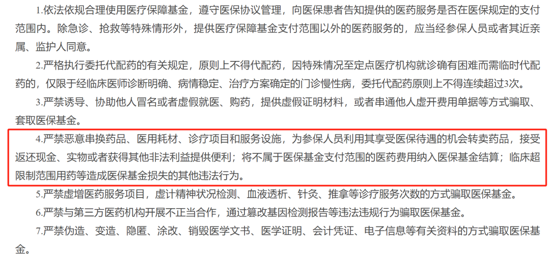 目前,各级医院陆续配置了“反统方”软件,且伴随监管趋严,院内数据收集的难度和风险大幅提高,商业统方问题已经得到明显遏制。 打击欺诈骗保,处罚力度再加强今日(4月8日),2024年全国医保基金违法违规问题专项整治工作会议召开。会上提到,做好2024年专项整治工作,其中包括强化飞行检查,做实定点医药机构违法违规问题自查自纠。严禁恶意串换药品、医用耗材、诊疗项目和服务设施,为参保人员利用其享受医保待遇的机会转卖药品,接受返还现金、实物或者获得其他非法利益提供便利;将不属于医保基金支付范围的医药费用纳入医保基金结算;临床超限制范围用药等造成医保基金损失的其他违法行为。去年6月,国务院新闻办公室举行国务院政策例行吹风会,其中提到:定点医药机构“明目张胆”的骗保行为有所遏制,但是“跑冒滴漏”现象依然比较普遍,骗保手段更趋隐蔽、更加专业,欺诈骗保和医疗腐败交织在一起,监管难度不断加大。基于医保基金对于民生的重要性,近年来相应监管正在全面升级。 今年3月,最高人民法院、最高人民检察院、公安部联合召开新闻发布会,发布“两高一部”《关于办理医保骗保刑事案件若干问题的指导意见》,其中提到:定点医药机构(医疗机构、药品经营单位)以非法占有为目的,实施下列行为之一,骗取医疗保障基金支出的,对组织、策划、实施人员,依照刑法第二百六十六条的规定,以诈骗罪定罪处罚;同时构成其他犯罪的,依照处罚较重的规定定罪处罚:年初召开的全国医疗保障工作会议上明确,2024年要强化基金监管高压态势。实现现场监管全面覆盖、非现场监管精准打击,发挥好治理医药领域腐败问题的探照灯作用。联合多部门聚焦重点领域开展专项治理,切实发挥好“以查促改”作用。