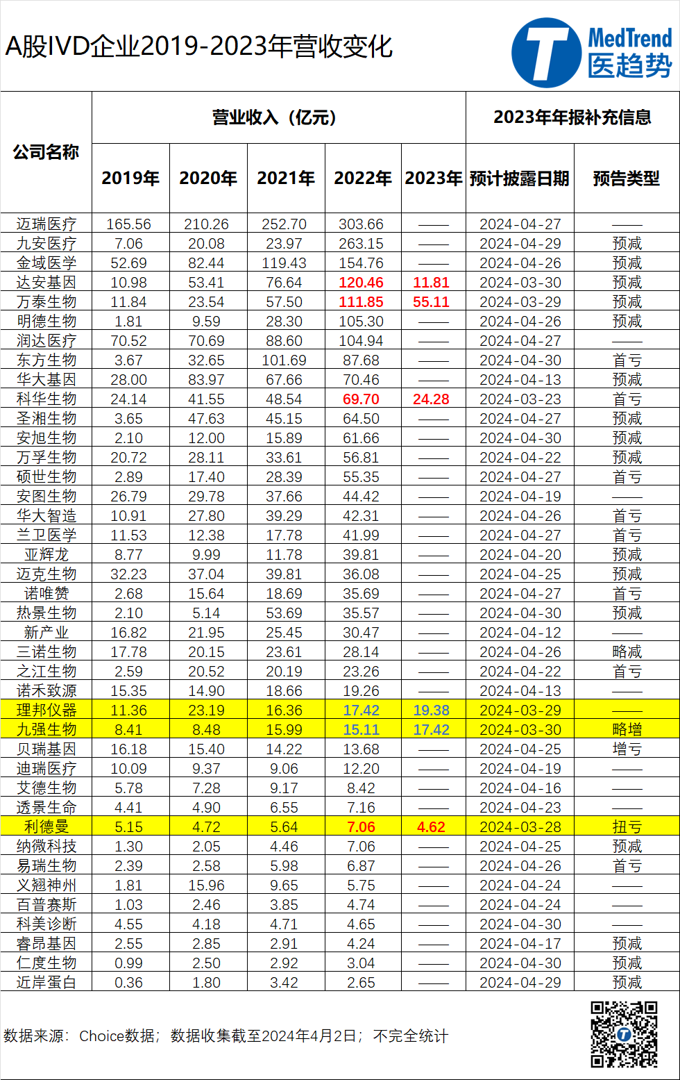 哀鸿遍野。 粗略统计A股40家IVD企业的2023年年报及预告,大片的预减、首亏让人触目惊心。更糟糕的是,如果拉长时间线,将2023年的业绩与2019年的业绩进行对比,有些企业甚至可以做到“毫无长进”。 潮水退去,裸泳者终将显现。 疫情相关因素之外,3大细分赛道的集采、投资的萎靡不振、强者恒强的虹吸效应以及来势汹汹的医疗反腐……压垮骆驼的,不是最后一根稻草,而是所有负重。 小企业的结局,难道真的只有死路一条吗? 01退潮 新冠的影响正在出清,带来一系列IVD企业财报的“退潮”。 在普遍4月中下旬发布年报的IVD企业中,国内分子诊断行业的龙头企业达安基因3月底发布的完整年报“令人瞩目”——从营业收入、净利润到总资产、净资产,清一色的负增长。 其中,2023年营业收入11.8亿元,比2022年下滑90.20%;归属于上市公司股东的净利润1.05亿元,同比-98.07%;归属于上市公司股东的扣非净利润直接变成了负数,-3.64亿元,同比-107.03%。 伴随利润骤降98%,达安基因努力自救,裁员1600多人(2022年底3580人,2023年底1968人)。研发人员数从2022年的995人下滑至729人,同比-26.73%。研发投入与2022年相比锐减52.84%至5.30亿元。 老牌IVD企业科华生物是酶免代表企业,但是在发光时代有所落后,流水线也刚刚开始。2023年营收下滑65.16%至24.28亿元,基本与2019年持平;2023年的归属于上市公司股东净利润亏损2.34亿元,同比-124.09%。 这家IVD企业近年来处于“多事之秋”。2018年投资5.53亿元收购天隆科技62%的股权,并约定在2021年收购天隆剩余股份。而天隆在2019年的非洲猪瘟检测、2020年的新冠疫情后业绩一飞冲天,到了2021年,总市值不到80亿的科华生物掏不出105亿来购买天隆的剩余股份,随后双方开启互相诉讼,直到2023年握手言和。 2024年3月,科华生物公告新一届的领导班子。李明先生当选为科华生物董事长并兼任总经理。在上述事件中,李明先生曾担任科华生物副总裁,后被罢免,后又成为总裁。 中国首富钟睒睒旗下的万泰生物主营疫苗和体外诊断产品。2023年营收腰斩至55.11亿元。其中,体外诊断业务营收15.33亿元,同比-42.66%。从总营收来看,相较于2019年11.84亿元的总营收,万泰生物的成长还算相对可观。 不过受资本市场医药板块整体调整影响,万泰生物的市值已经从巅峰时期的1800多亿缩水至零头(815亿元)。 “退潮”的不止是业绩,还有薪酬、IVD企业的数量以及IPO上市量。 今年年初,上海某知名肿瘤基因检测公司全员降薪的消息在行业内盛传,降薪幅度大约在10-30%。而从达安基因的年报来看,高管们的年薪也从500多万降到了100万左右,降幅近80%。 与此同时,纯靠新冠筛查业务的区域检验所在疫情之后陆续倒下 IPO的情形更是不容乐观,相比于2021年、2022年先后18家、7家IVD企业上市的“盛况”,2023年IVD企业在A股颗粒无收。而2024年至今,菲鹏生物深交所创业板IPO注册结果变更为“终止注册”;翌圣生物上交所科创板IPO终止。 02逆势增长 “退潮”之下,也可以看到谁在“逆势增长”。 在一众“预减”、“首亏”之中,九强生物属于“逆势增长”的那一个。 2023年,九强生物营收17.42亿元,相较于2022年增长15.27%。归属于上市公司股东的净利润5.24亿元,同比+34.60%。拟向全体股东每10股派发现金红利2元(含税)。如果与2019年的营收相比较,到了2023年,九强生物的营收已经实现了翻倍增长。 业绩驱动因素中,主要包括:医疗机构需求恢复带动生化及病理试剂销售增长;不断加大市场开拓力度;23省肝功生化集采结果落地,九强生物参与集采项目全部中标;深化企业合作,发挥协同效应,提质增效积极推动发展。 聚焦医疗电子设备产品和体外诊断产品的理邦仪器2023年业绩也相对不错。营收19.38亿元,同比+11.22%。其中,体外诊断业务营收3.56亿元,同比+19.79%,贡献了五大细分业务中(病人监护、妇幼健康、心电诊断、体外诊断、超声影像)的最高增长。血气生化分析仪、磁敏荧光免疫分析仪属于理邦仪器体外诊断的强驱动。 产品以呼吸道病原体检测为主的英诺特的业绩快报显示,2023年实现营业收入4.78亿元 而在2024年3月31日,也就是Q1刚刚结束当天,英诺特迫不及待地披露了一季度业绩预告——宣布预计Q1营业收入为2.57亿元-2.85亿元 显然,对于IVD企业业绩形成主要影响的,一是政策,二是产品。 03洗牌加速 政策方面,主要分为集采、医疗服务价格改革、医疗反腐三个层面。 首先,集采持续推进,淘汰和洗牌,仍将是2024年IVD行业的主旋律。 截至目前,广东牵头新冠试剂集采、江西牵头肝功生化试剂集采,安徽牵头化学发光试剂集采早已成果斐然。 3月15日,甘肃刚刚发布《关于公示甲状腺功能检测试剂集中带量采购拟中选结果的通知》,甲功检测试剂集采也已然落地实施。 4月2日,网络上流传出一份江西医保局关于生化检测类试剂带量采购企业座谈会的文件。根据文件显示,此次江西医保局发出的意向带量产品,共12个类别74个项目,涵盖了离子/微量元素、糖代谢、血脂、特种蛋白、肝功能、凝血与纤溶、肿瘤标志物、感染与过敏、胰腺类、胃筛查、肾功、心肌类。假如文件落实,生化试剂将成为IVD行业第一个全部纳入带量采购的细分行业。 从国家政策来看,医保工作相关会议明确:加强统筹协调,合理确定采购品种,国家组织集采仍为多家过评药品,“价高量大”的医用耗材。扩大联盟采购范围,形成全国联盟。更多的产品纳入带