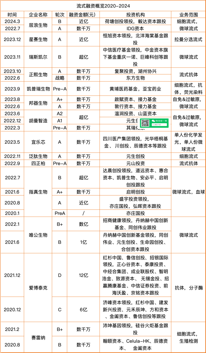 细胞流式和微球流式八二开,前者占比大,后者增速更高,年复合增长率达9.2%,且主要由北美/欧洲外的新兴市场所贡献。前三年国内比较火爆的流式细胞因子检测即属于此类。流式细胞行业是高度依赖试剂和服务的领域。2021年试剂/耗材占53%,且今后将保持8.6%的年复合增长率,软件/服务预计年复合增长率也高达9.3%。仪器的年复合增长率则为6.4%。从最终用户来看,研究机构和大学2021年占42.6%,为第一大客户源。到2027年研究机构和大学的比例会降到39.8%;第二大来源为制药和生物技术公司以及CRO;医院和临床检测实验室在2021年占比为25%,今后会保持10.3%的最高年复合增长率。在以上报告的各个分领域,新兴市场的增长率均高于北美和欧洲两大市场。根据【陈在不在】的经验,终端销售额,流通商数据和制造商数据之间大相径庭,我们不能将其简单混为一谈,期间极有可能存在重复计算。如果以制造商的出货口径计算,2022年大陆流式细胞市场容量预计在40亿左右。如果采信国外市场机构的全球报告数据,按中国占全球10%~15%计算,则为5.2亿~7.8亿美金。国内细胞流式仪器发端于2013年左右,杭州艾森、苏州赛景、深圳迈瑞机器次年上市,以小体积,固态激光,高采样速度,20比特以上信号处理器为特点。其后艾森,赛景分别被安捷伦,贝克曼库尔特收购。最早的仪器供应商花开数朵,又衍生出一系列公司。国内微球流式最早由嘉兴凯实,透景生命,湖北新纵科所开发,用于细胞因子,自身免疫和过敏原,肿瘤标志物检测。不完全统计,国内流式仪器制造商超过40家,其中获得细胞流式医疗器械注册证的公司为25家,包括国内生产的贝克曼库尔特和安捷伦,不包括注册证到期的博奥新景,他们提供各种配置的荧光分光流式、全光谱流式和质谱流式。获得微球流式医疗器械注册证的公司为11家,包括全自动连续进样机器8家,半自动或批式进样机器2家,以及成都宜乐芯的单人份机器。流式荧光单抗生产厂家更多,目前形成规模的有旷博、凯美瑞、四正柏和爱博泰克等公司。最近几年,流式是投融资相对活跃的领域,流式抗体、细胞流式、微球流式全部涵盖。图4 近年流式投融资