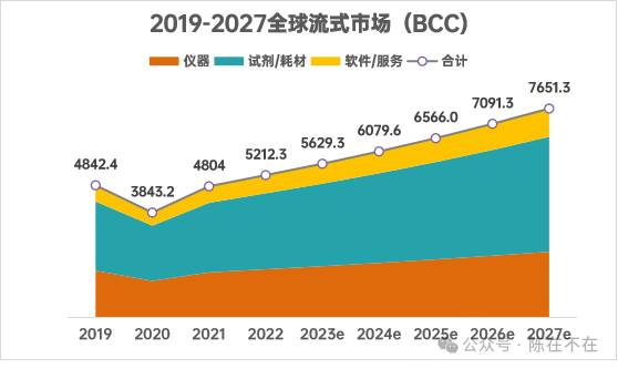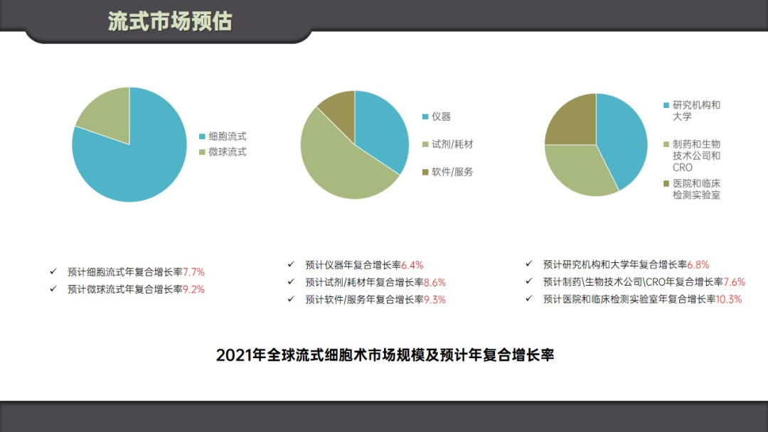 流式试剂主要有两大类:一类是荧光单抗;一类是基于微球流式的多组分联检试剂盒。根据BCC于2023年1月发布的报告BIO085E《流式细胞术:产品、技术及全球市场》,全球流式细胞术市场将从2021年的48亿美元增长到2027年的76亿美元,年复合增长率8.0%。