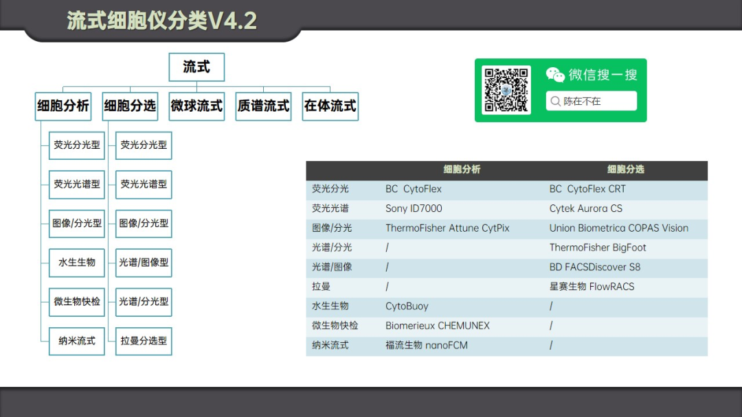 与钟生相识于流式推广之路,数次从创业和投资角度得到其深入浅出的指导,乐见流式赛道的不断发展壮大,期待发现行业的问鼎密码。流式细胞仪(Flow Cytometer),顾名思义是一类描述流动的细胞或粒子的仪器。它是通过检测高速流动状态下的细胞信号,从而获得细胞的大小、结构、组成等特征性信息,以及根据这些物理化学特征精确分选细胞。应用流式细胞仪分析和分选的技术,被称为流式细胞术(Flow Cytometry),它具有检测速度快、分析参数多、获取信息量大、灵敏度高、准确性好、方法灵活等优点。当然,最大特点是同时分析参数多。根据功能可以把流式细胞仪分为分析型流式细胞仪和分选型流式细胞仪。分选型是以分析为基础的,先看到,再得到。根据检测信号可以把流式细胞仪分为荧光流式、拉曼散射流式、质谱流式和图像流式。