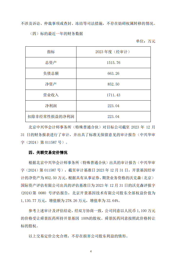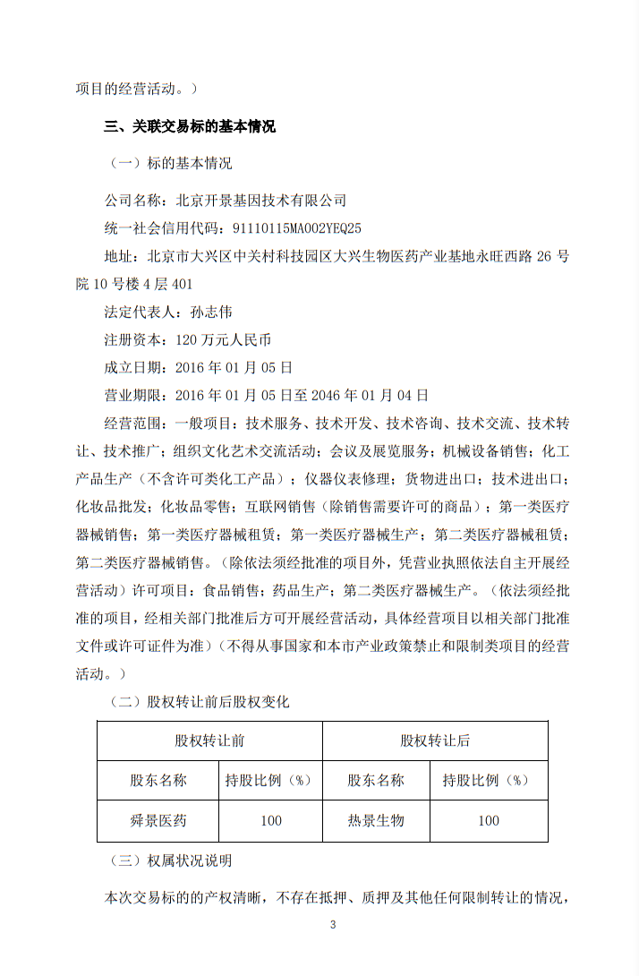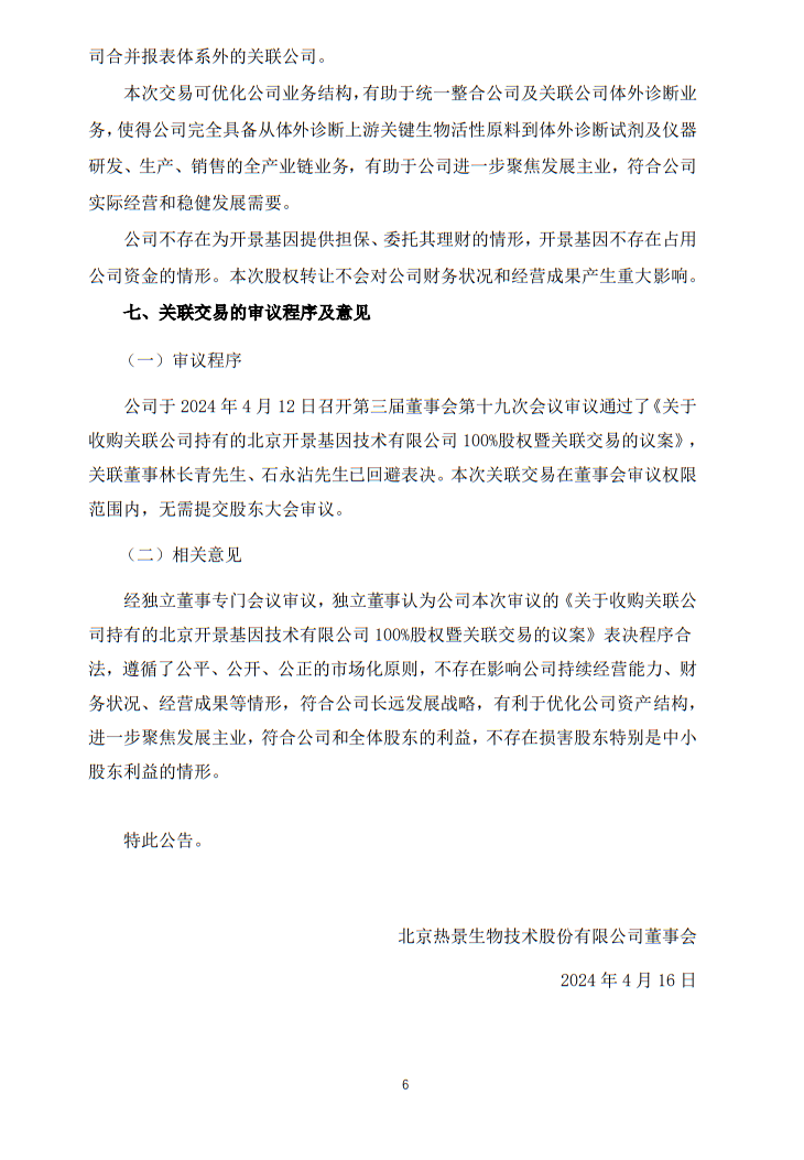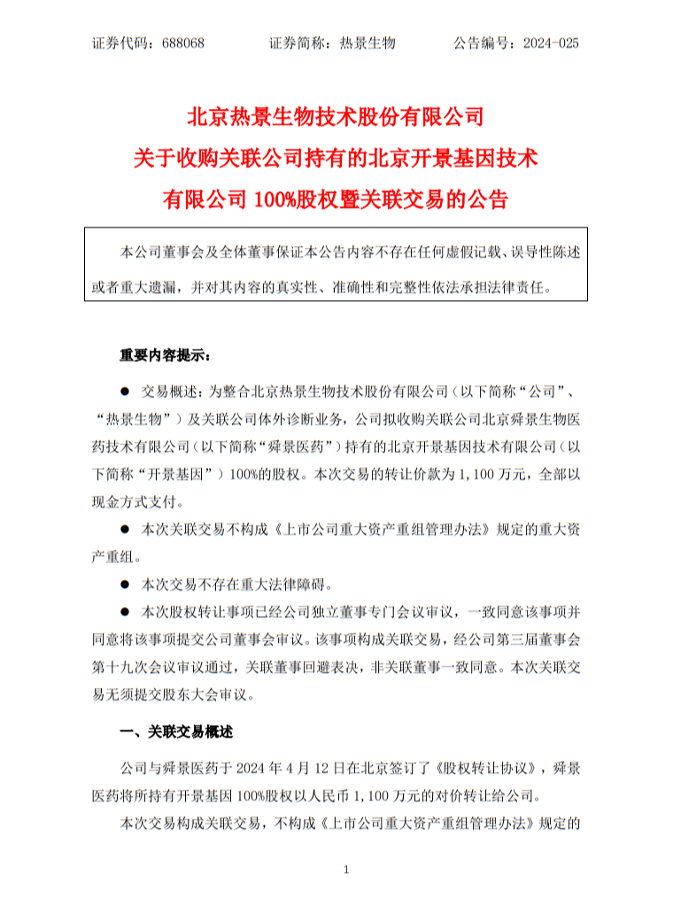 4月15日晚间,热景生物(688068)发布公告称,为整合公司及关联公司体外诊断业务,公司拟收购关联公司舜景医药持有的开景基因100%的股权。本次交易的转让价款为1100万元,全部以现金方式支付。本次交易可使得公司完全具备从体外诊断上游关键生物活性原料到体外诊断试剂及仪器研发、生产、销售的全产业链业务。 开景基因成立于2016年,是专业从事体外诊断试剂原料研发、生产及销售于一体的生物技术服务公司。热景生物表示,本次交易可优化公司业务结构,有助于统一整合公司及关联公司体外诊断业务,使得公司完全具备从体外诊断上游关键生物活性原料到体外诊断试剂及仪器研发、生产、销售的全产业链业务,有助于公司进一步聚焦发展主业,符合公司实际经营和稳健发展需要。 |