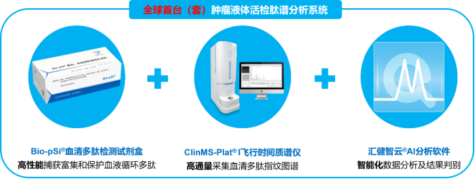 ClinMS-Plat® I质谱仪与配套试剂盒(Bio-pSi®系列)使用,单次检测可获得包含数百个血清多肽分子的指纹图谱。汇健科技结合人工智能算法构建了包含数万例肿瘤人群队列样本、数十万例次检测数据的人工智能判别模型(汇健智云®)。未来,该款型号的质谱仪将与诊断试剂、AI分析软件三者共同组成一整套体外诊断分析系统(下图),可用于各种肿瘤、泌尿系统疾病,神经系统疾病等多种疾病筛查、辅助诊断和复发转移评估等领域。