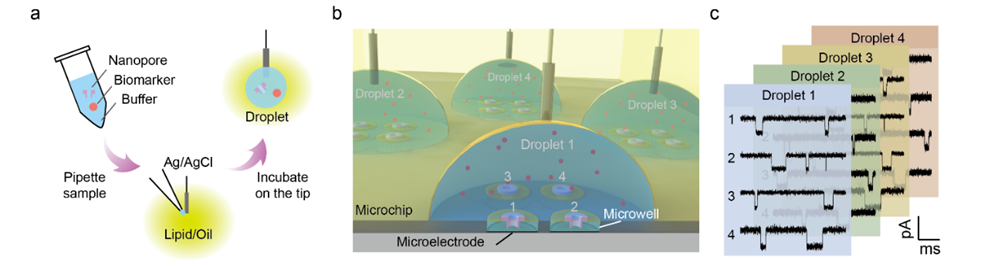 生物标志物存在于各种新陈代谢过程中,需要在单分子水平上进行精确细致的分析,以进行准确的临床诊断。鉴于对高灵敏度的需求,生物纳米孔已被应用于单个生物标志物的传感。然而,由于低容量生物标志物在稀释缓冲溶液中的浓度较低,而且难以进行平行检测,这给检测带来了挑战。针对在单分子水平灵敏检测低丰度生物标志物的需求,南京大学应佚伦教授发展了一种液滴纳米孔道单分子检测技术,在阵列微芯片上实现了在单分子水平上皮克级生物标志物的高通量、快速、无标记检测。该成果以“High-throughput single biomarker identification using droplet nanopore”为题,发表在英国皇家化学会期刊Chemical Science上。图1 基于液滴纳米孔道微芯片系统的单分子电化学分析:(a)微液滴制备;(b)阵列化液滴纳米孔道电化学分析芯片;(c)高通量单分子电化学分析该工作利用光刻技术构建了纳米孔道阵列电化学测量微芯片,并设计了可支持多个双层膜的分离式多微孔,每个微孔都集成了一个连接到独立放大器的Ag/AgCl微电极,可进行多通道电流记录。相关可行性验证结果表明,这种纳米孔传感平台可以将血管紧张素II等各类生物标志物的检测限大幅降低到42 pg。