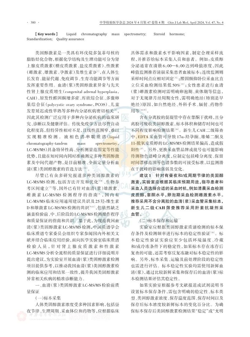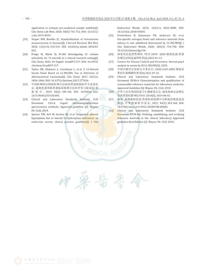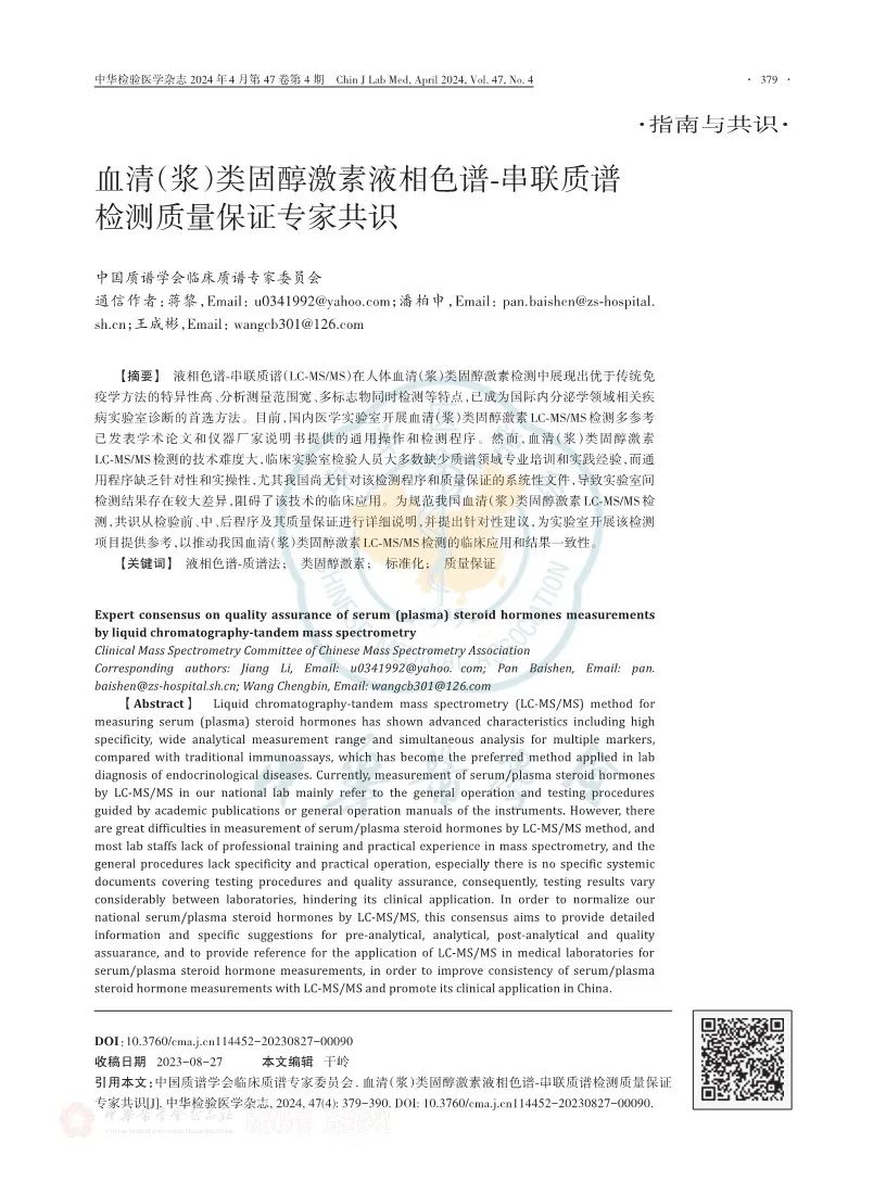 近日,中国质谱学会临床质谱专家委员会最新发布了《血清(浆)类固醇激素液相色谱串联质谱检测质量保证专家共识》,针对血清(浆)类固醇激素检测,涵盖了19个类固醇激素目标物,旨在确保检测结果的准确可靠性。 类固醇激素在血浆中的含量极低(pg含量),常规检测手段如生化免疫学往往很难精准检测,而且免疫学方法可检测的激素项目有限,且不同免疫平台的检测结果差异较大。遇到非特异性干扰时,检测结果可能给临床诊断带来困扰。而LC-MS/MS方法与传统方法相比具有更高的灵敏度和特异性,能够准确测定目标物的浓度,在激素检测中具有巨大优势,从而为临床诊断和治疗提供更可靠的依据。目前,质谱技术已经是激素类项目实验室检测公认的金标准。 但是开发一项质谱检测类固醇激素的完整方案是十分复杂的。该共识的发布将标准化检测过程,明确了样品处理、仪器校准、数据分析等关键步骤,从而为各个医学实验室提供了统一的操作指南。这不仅有助于提高检测的准确性和可靠性,也为医学研究和临床实践提供了更可靠的基础和质量保障。 附件: |