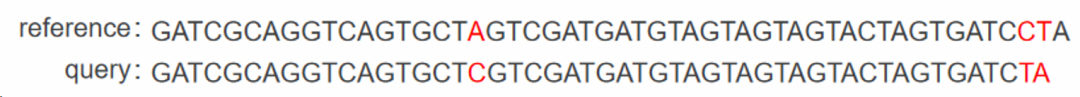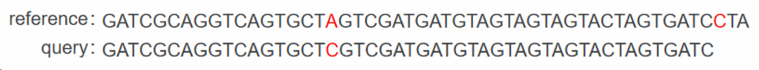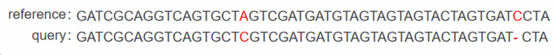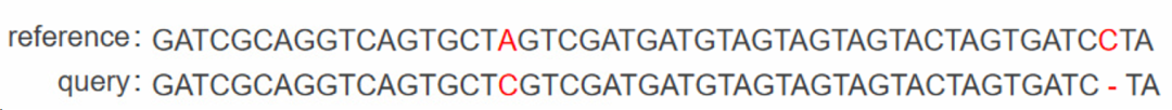 假设有这么两条序列,来看看不同的参数如何影响最终的比对结果: 参考序列长51bp,查询序列长50bp。查询序列与参考序列有两个不同,一个是第18位有个替换(A>C),一个是尾部有个单碱基缺失(C>)。使用BWA MEM默认参数比对结果如下:
