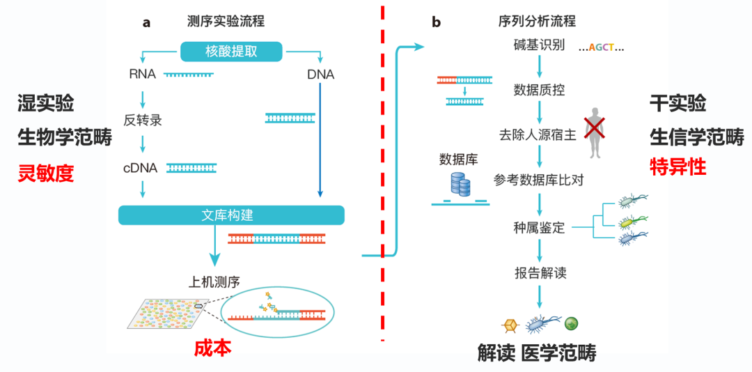 我2017年毕业以后进入头部基因公司医学信息中心做生信,前半年主要做NGS数据质控、RNA-seq、WGS和WES等比较传统的生信分析。2018年开始负责临床病原微生物基因检测产品的生信分析,也就是临床mNGS。 mNGS在临床上推广也是从那时刚刚开始,一个新人进入了一个新的领域,也算得上是最早的那批人了。2019年到现在的公司后至今还是一直在做mNGS,在mNGS领域摸爬滚打了近7年,应该算差不多可以入门了,也只会做这个。 虽然时至今日已经有很多关于mNGS性能评估及应用的文献或专家共识发表,但从跟很多医生或专家的交流中感受到,大部分人对mNGS的生信内容还是很模糊的认识。基因组数据库怎么来的,物种分类怎么做,背景菌怎么分析,假阳假阴怎么回事,分析结果准不准等等都是一些常见的问题。很多医生,包括监管部门都不会只满足于“科普型”的解释,都很关心这些问题的真正难点是什么?能不能解决?有没有具体的解决方案等等。而这一些问题都是少有甚至没有文献可以参考的。 这些问题总结起来就是:mNGS生信面临的真正挑战是什么? 这是一个非常宏大的问题,此外,临床mNGS完整流程包括:样本采集、运输、湿实验、干实验(生信)、临床解读等等一系列环节,每个环节都有非常深入的学问,并且环环相扣。 图1. mNGS全流程示意 生信其实跟每一个环节都关联,脱离了任何一个环节的信息都可能无法完成分析或者得出准确的结果。但限于能力和篇幅,这里仅聚焦于讨论纯生信的部分。 图2. mNGS湿实验和干实验的内容。湿实验属于生物学范畴,难点是要解决灵敏度的问题,样本里面有什么就能测出来什么;干实验是信息学范畴,难点是要解决特异性的问题,测序数据里面有什么就要准确鉴定出来什么,同时还要能区分其来源(来源于样本还是实验噪音)。 这些年无论是给内部培训,还是给外部分享,多多少少都有分享一些经验或看法。如今梳理总结一下,纯个人鄙见,不全面,也不一定对,欢迎交流。 要回答这个问题,我们得先从mNGS的临床需求入手。临床的需求是什么?mNGS可以解决临床的这些需求吗? 从应用场景的角度看,mNGS主要应用于疑难、急危重症的感染患者。 “疑难”说明可能常规的检验方法学都试过了,没有查出真正病原,所以对mNGS的需求就是具备“全面且准确”的检测能力,能覆盖传统方法学以外的检测范围或灵敏度。“急危重症”,说明时间等不起,需要尽快明确病原体马上对症下药,所以对mNGS的需求除了“全面且准确”外,还有“快”的需求。还有一点,从患者的角度考虑,还需要做到“经济可负担”。 “全面、准确、快、经济可负担”这些可能就是mNGS的核心问题。需要再次强调,mNGS是一个整体的技术,解决这些核心问题也是需要从全流程去考虑的,生信只是其中的一部分。如果将这些问题拆解到生信里面去,对应的几个关键点就是“基因组数据库全面(决定着检测范围)、物种分类鉴定准确、分析时间快、硬件成本可负担”等。 这里面的任何一点单独做到也许是简单的,但是要全部满足似乎就是一个“不可能三角”。基因组数据库做“全”了也许会因为基因组错误的积累或者同源干扰太多导至假阳假阴增加,无法做到“准”,也因为数据库太大导至分析时间长而无法做到“快”,或者靠堆硬件计算资源实现了“快”而导至“成本”很高。兼顾所有是mNGS生信的真正挑战所在。 先看看mNGS生信分析流程的一个例子: 图3. mNGS生信分析过程。主要过程为:测序>fastq拆分>数据质控>人源序列过滤>微生物数据库比对>种属分类鉴定>报告解读等。有些还可能包含耐药和毒力的分析过程。 人源序列过滤、微生物基因组数据库、分类鉴定算法、报告解读等这些内容是影响mNGS生信性能的关键所在。 人源序列过滤是保证mNGS结果准确的关键之一 因为标本是从人身上采集的,测序数据里面大部分序列都是人源的,可达95%以上,若湿实验环节没有去宿主措施甚至可达99%以上。如果不对这些人源序列进行过滤,在微生物数据库比对环节,一是因为数据量太大所需的比对时间特别长,二是因为基因组同源或者微生物污染人源序列的问题,导至很多微生物的假阳性检出。 人源序列过滤的挑战在于,不仅要过滤,还要过滤得“全”。为什么要过滤得“全”?因为微生物基因组污染了大量的人源DNA,至于这些污染是怎么来的可以参考图4及其文献。 图4. The Human “Contaminome” and Understanding Infectious Disease. Simner PJ, et al. N Engl J Med. 2022 人类参考基因组不管是GRCh38,还是刚发布不久目前最完整的T2T-CHM13,或者黄种人的YH2.0,其实都还是个人基因组或者少数几个人的基因组。英国15万人群基因组测序项目的分析表明平均每个个体基因组存在约341万个SNPs或indels,且不同地域(欧洲、非洲、亚洲)人群间的变异差异更显著(https://doi.org/10.1038/s41586-022-04965-x)。对于人类来说,这个变异的比例也许很小,但是在mNGS测序数据里面,如果宿主序列占比为99%,人类序列过滤后即使只有1%的残留,在剩余的序列里面,人类的序列占比仍然高达约50%!这些序列在后续流程中都是要进行微生物数据库比对的,会产生多少假阳性? 我相信做过mNGS生信或解读的人在这点上是有体会的:明明已经过滤了人源序列,为什么检出的病原体序列拿去BLAST比对是时候还是会比上人的序列? 图5. 一例样本检出了Trichosporon asahii(阿萨希丝孢酵母),提取其序