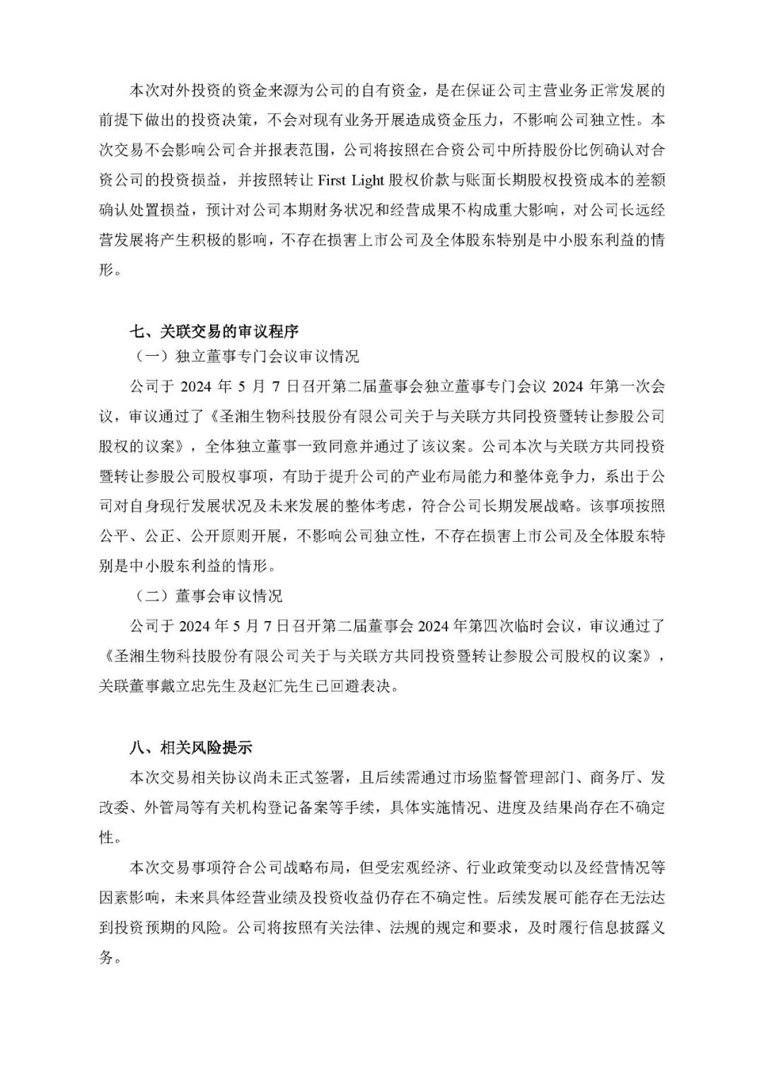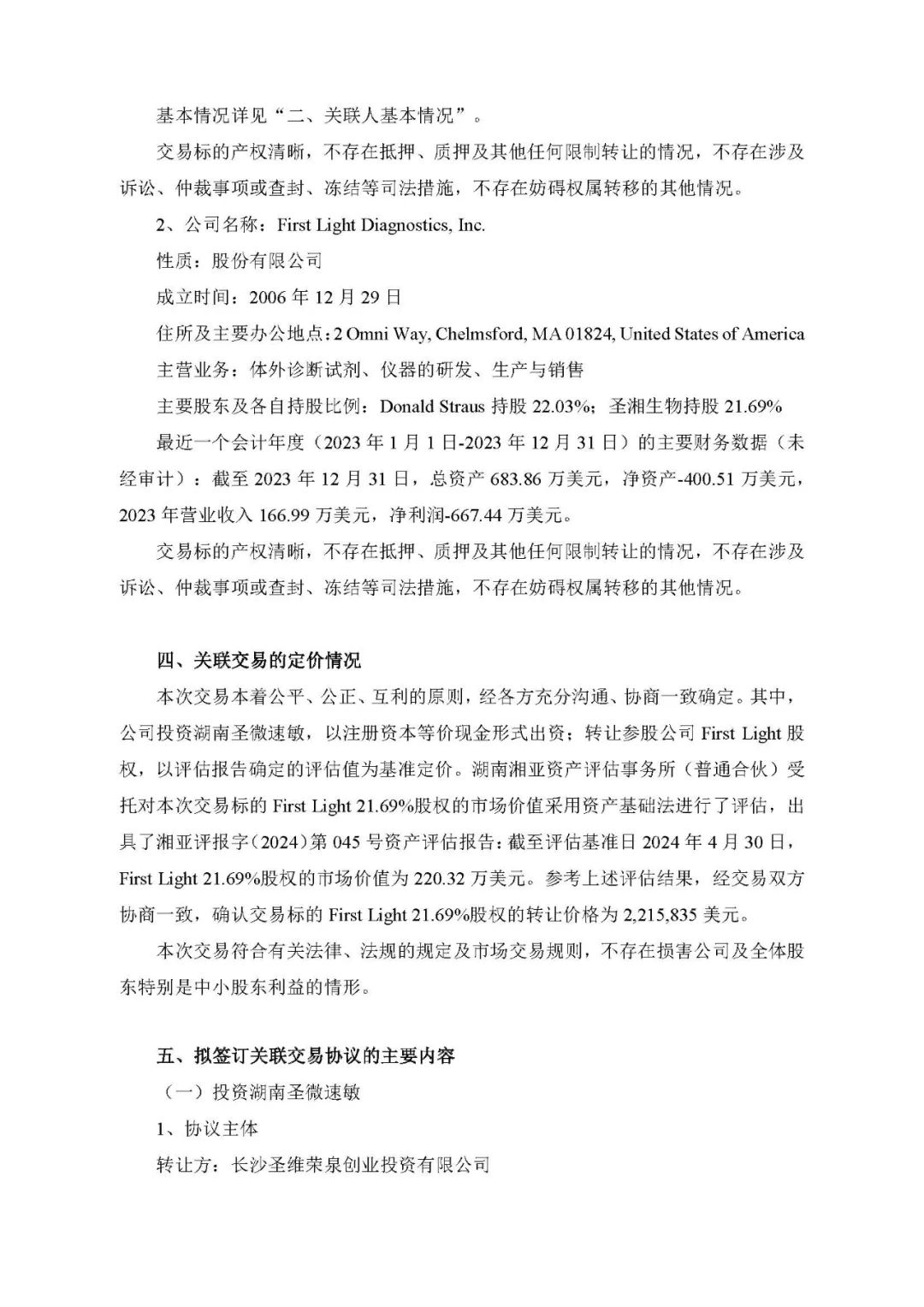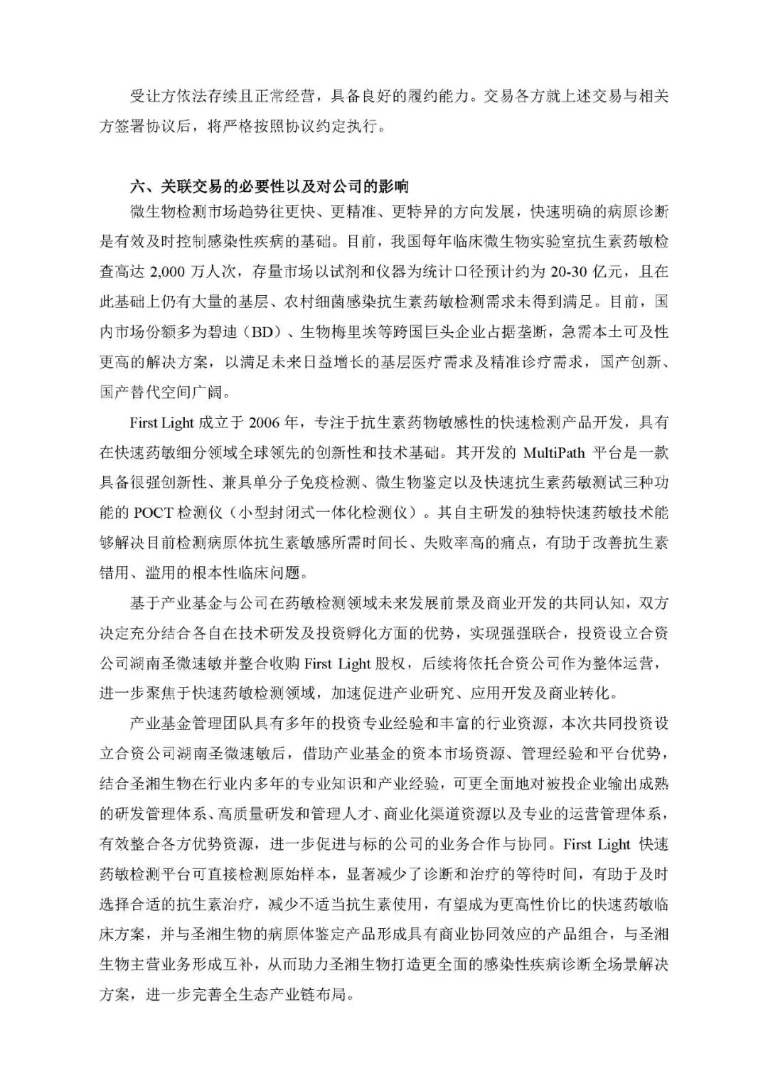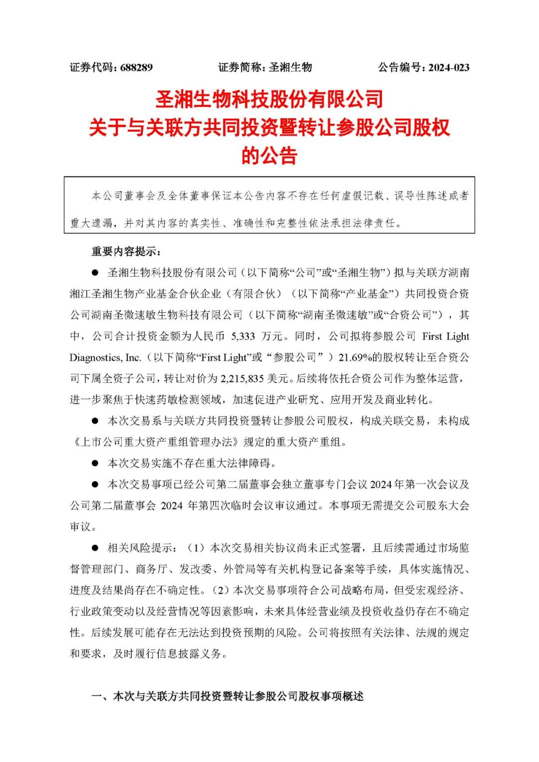 | 圣湘生物5月8日公告,公司拟与关联方湖南湘江圣湘生物产业基金合伙企业(有限合伙)共同投资合资公司湖南圣微速敏生物科技有限公司,其中,公司合计投资金额为5333万元。同时,公司拟将参股公司FirstLight 21.69%的股权转让至合资公司下属全资子公司,转让对价为221.58万美元。后续将依托合资公司作为整体运营,进一步聚焦于快速药敏检测领域,加速促进产业研究、应用开发及商业转化。