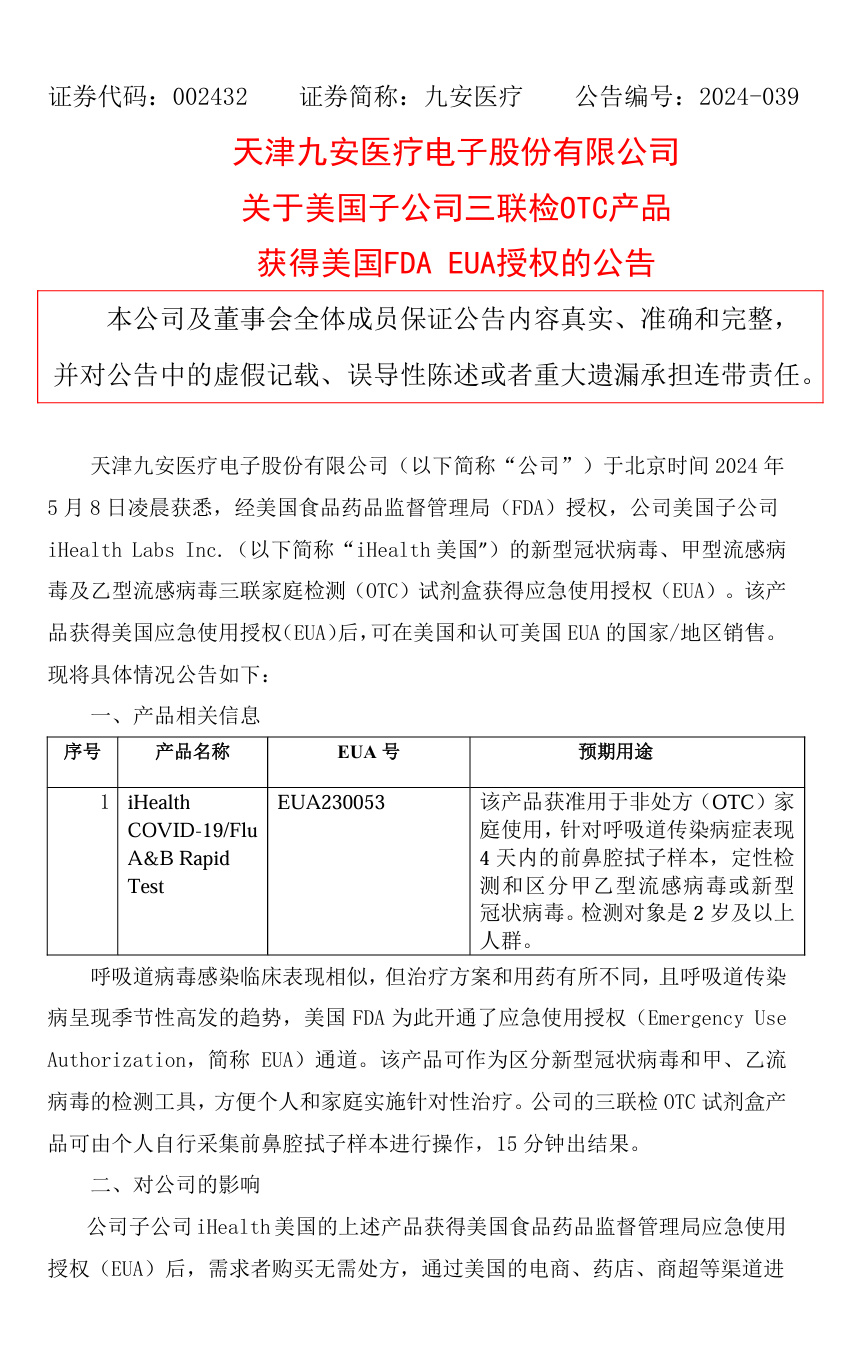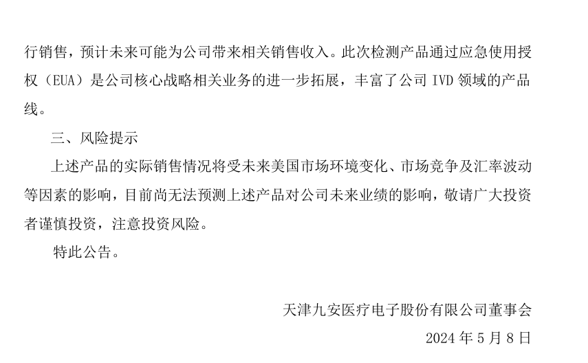 公告称,该产品获得美国应急使用授权(EUA)后,可在美国和认可美国EUA的国家/地区销售。需求者购买无需处方,通过美国的电商、药店、商超等渠道进行销售,预计未来可能为公司带来相关销售收入。