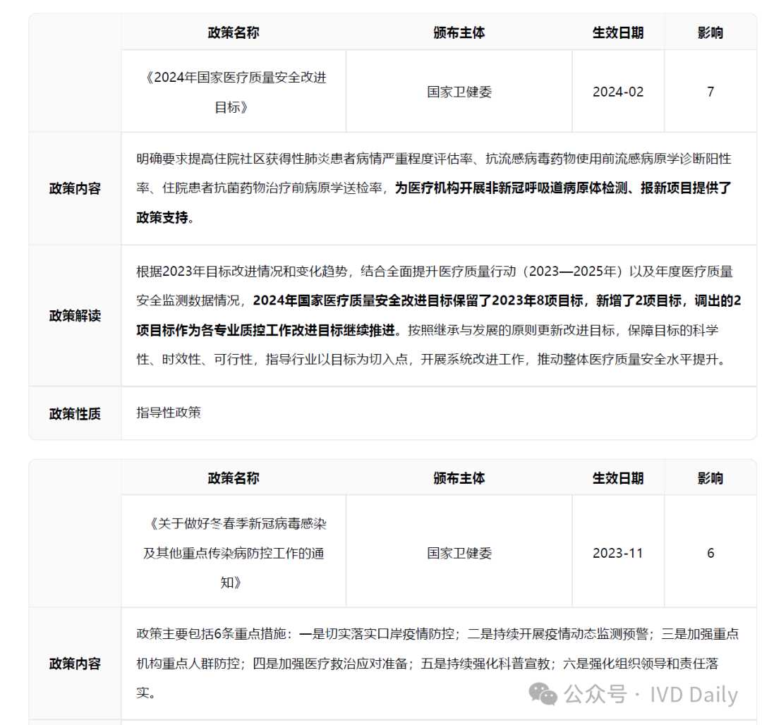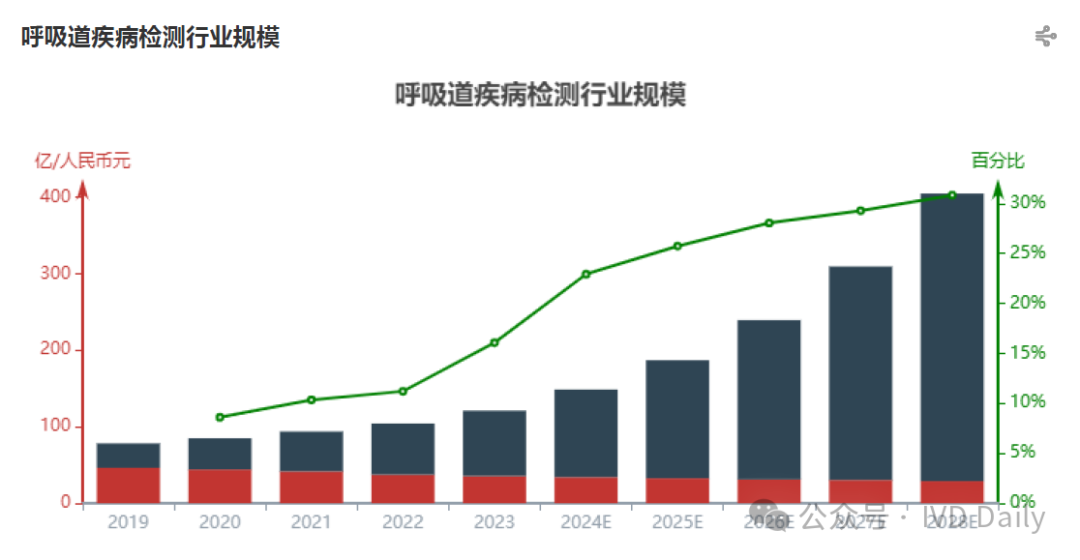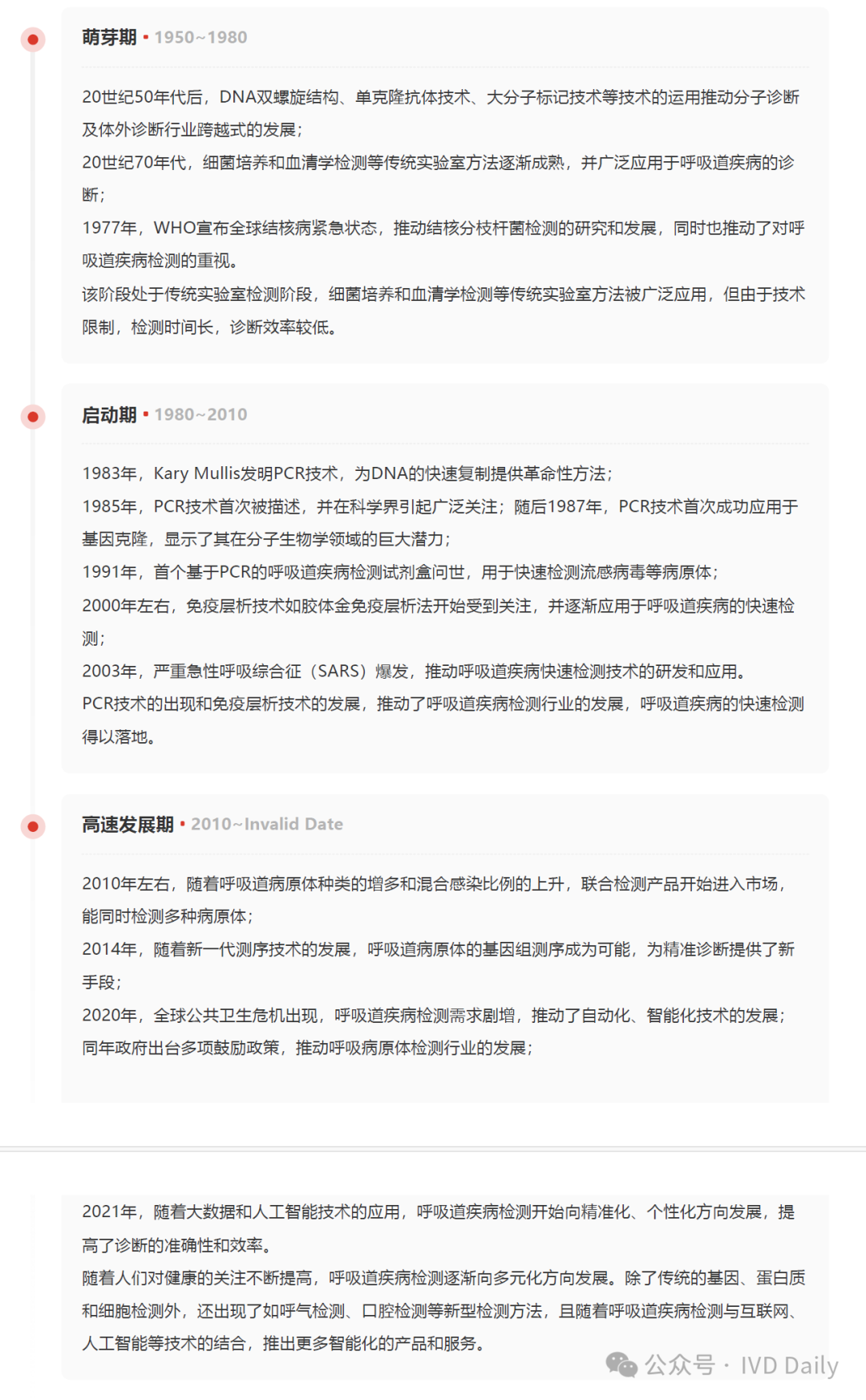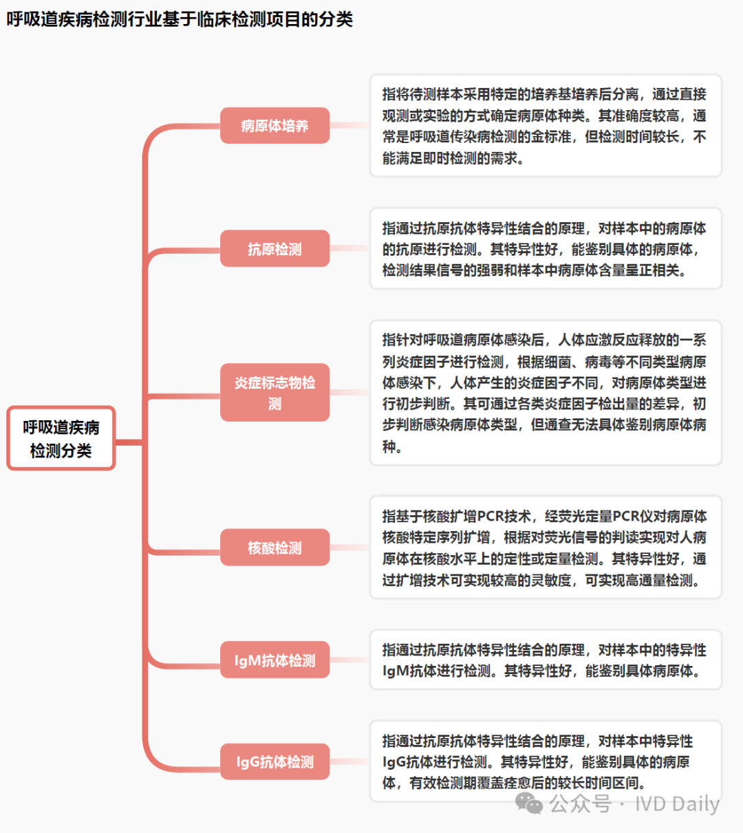 呼吸道疾病检测行业定义 呼吸道疾病是临床常见的疾病类型,可分为上呼吸道感染和下呼吸道感染。其中,上呼吸道感染主要累及鼻腔、咽喉部等,包括鼻炎、鼻窦炎、咽炎等;下呼吸道感染多为喉以下的气管、支气管感染及肺部感染,包括支气管炎、肺炎、肺结核等。呼吸道疾病检测是指通过对患者的呼吸道样本进行检测和分析,以确定是否存在呼吸道疾病的一种医学检测方法;其针对各种呼吸道疾病的预防、诊断和监测,通过提供一系列的检测产品和服务,以帮助医疗机构和患者及时发现、诊断和治疗呼吸道疾病。 呼吸道疾病检测行业分类 常见的呼吸道病原体主要包括流感病毒、腺病毒、呼吸道合胞病毒、肺炎支原体、人偏肺病毒、人副流感病毒等。按照临床检测项目的分类方式,呼吸道疾病检测行业可以分为如下类别: 呼吸道疾病检测行业特征 呼吸道疾病检测行业的特征包括:呼吸道疾病发病人数常居高位,检测需求稳定;多联检测有利于实现对呼吸道感染的精准诊疗,推动检测市场扩容和快速检测助力呼吸道疾病诊疗。 1 呼吸道疾病发病人数常居高位,检测需求稳定 中国是人口大国,呼吸道传染病发病人数在中国常居高位,常见的呼吸道感染以流感等丙类传染病为主。根据国家疾病预防控制局,2023年丙类法定传染病报告发病数达1,567.7万人,同比增长268.0%,其中流感发病数达1,252.8万人,同比增长407.7%。2023年呼吸道疾病高发,有流感、支原体肺炎等多病原体共同传播的影响,且伴随一定季节性,2023年呼吸道感染人数创十年最高。检测是准确用药的前提,呼吸道疾病的爆发将带动检测需求的大幅增长,为检测试剂企业带来大量订单需求。 2 多联检测有利于实现对呼吸道感染的精准诊疗,推动检测市场扩容 由于感染不同呼吸道病原体的临床症状和体征较为相似,但病理、病程和治疗方法却存在显著差异,呼吸道多联检测能够快速鉴别多种呼吸道病原体,在临床上具有重要意义。多家体外诊断上市公司加快在多种呼吸道病原联合检测领域的布局,如金域医学基于不同检测平台,开展了呼吸道病原体核酸6项、呼吸道多种病原体核酸检测18项及上呼吸道多种病原体靶向测序107种等检测项目。虽然多联检测的研发周期长、注册认证壁垒高,但其更符合呼吸道疾病的快速诊断需求,将有助于推动呼吸道检测市场快速扩容。 3 快速检测助力呼吸道疾病诊疗 呼吸道感染由病毒、细菌、支原体、衣原体等不同的病原体引起,针对不同类型的病原体,用药不同,诊疗方式各异。快速检测技术虽存在一定的假阳性,但无需增加太多软硬件的投入,即可满足基层医疗机构、门急诊的快速诊断需求,其缩短了患者等待时间,降低院内传播的风险,有助于加强院感控制,合理的调配有限的医疗供给,缓解医疗资源的紧张。 呼吸道疾病检测发展历程 自20世纪50年代后,DNA双螺旋结构、单克隆抗体技术、大分子标记技术等技术的运用推动分子诊断及体外诊断行业跨越式的发展,至今已经历70余年的发展。20世纪80年代中期,PCR技术的出现,为DNA的快速复制提供了可能,随后免疫层析技术的出现,进一步推动呼吸道疾病的快速检测发展。2010年后,联合检测产品开始进入市场,且伴随着新一代测序技术的发展及人工智能的应用,呼吸道疾病检测开始向精准化、个性化方向发展,提高了诊断的准确性和效率。 呼吸道疾病检测产业链分析 呼吸道疾病检测行业产业链上游为原材料供应商,主要包括用于制备检测试剂的生物制品原料和精细化学原料,以及用于生产配套检测仪器的电子和机械元器件、配套软件等;产业链中游为呼吸道疾病检测试剂生产商,负责检测试剂的研发、生产及销售;产业链下游为应用终端,包括医院、体检中心、第三方诊断机构、个人等终端客户。 呼吸道疾病检测行业产业链主要有以下核心研究观点: 上游试剂原料需求旺盛,随着国产企业技术进步,国产化率有望持续提高。在体外诊断行业的带动下,酶、抗原和抗体等体外诊断试剂原料市场需求快速上升,但原料仍以进口为主,国产化率有望进一步提高。中国体外诊断原料中进口产品市场份额超87.7%,国产原料占比较少,但受益于中国企业技术水平的不断提升以及对生物科技产业供应链本地化重视程度的不断加强,国产替代原材料有望进一步加速。 中游产品丰富,获得较多产品注册证的企业拥有先发优势。中国已获批上市的呼吸道疾病检测产品丰富,截至2023年11月30日,中国已批流感检测试剂盒98项,其中仅检测甲型的占比31.6%、仅检测乙型的占比11.2%、仅检测副流感的占比11.2%,联合检测占比45.9%;肺炎支原体检测试剂112项;RSV检测试剂38项。达安基因、安图生物、亚辉龙和英诺特等上市企业在上述呼吸道疾病检测产品中拥有较多注册证,位居市场前列,拥有先发优势。 下游患者人数庞大,诊断检测需求空间广阔。中国呼吸道传染病发病人数常居高位,常见的呼吸道疾病感染以流感等丙类传染病为主,近期流感监测数据已超过过去3年同期。据国家疾病预防控制局,2023年丙类法定传染病报告发病数达1,567.7万人,同比增长268.0%,其中流感发病数达1,252.8万人,同比增长407.7%。检测是准确用药的前提,呼吸道疾病的爆发将带动检测需求的大幅增长,为检测试剂企业带来大量订单需求。 产业链上游说明 上游原料市场快速扩张,国产化率有望持续提高。