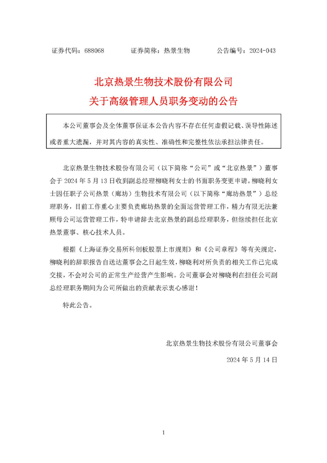 整理自热景生物 北京热景生物董事会于2024年5月13日收到副总经理柳晓利女士的书面职务变更申请。柳晓利女士因任职子公司热景(廊坊)生物技术有限公司总经理职务,目前工作重心主要负责廊坊热景的全面运营管理工作,精力有限无法兼顾母公司运营管理工作,特申请辞去北京热景的副总经理职务,但继续担任北京热景董事、核心技术人员。 据2023年年报,柳晓利简历: 1984年8月出生,中国国籍,无境外永久居留权,硕士研究生学历,中级工程师,北京市大兴区优秀青年人才。2011年6月毕业于沈阳农业大学,清华大学经济管理学院高级管理人员工商管理硕士(EMBA)在读。2011年7月至2014年1月,任北京华农纳米科技有限公司项目经理;2014年1月至2021年8月,历任热景生物研发项目负责人、研发转化部经理、质量总监;2021 年 8 月至今,先后任职廊坊热景副总经理,体外诊断研发中心副总经理,公司核心技术人员、董事、副总经理。 |