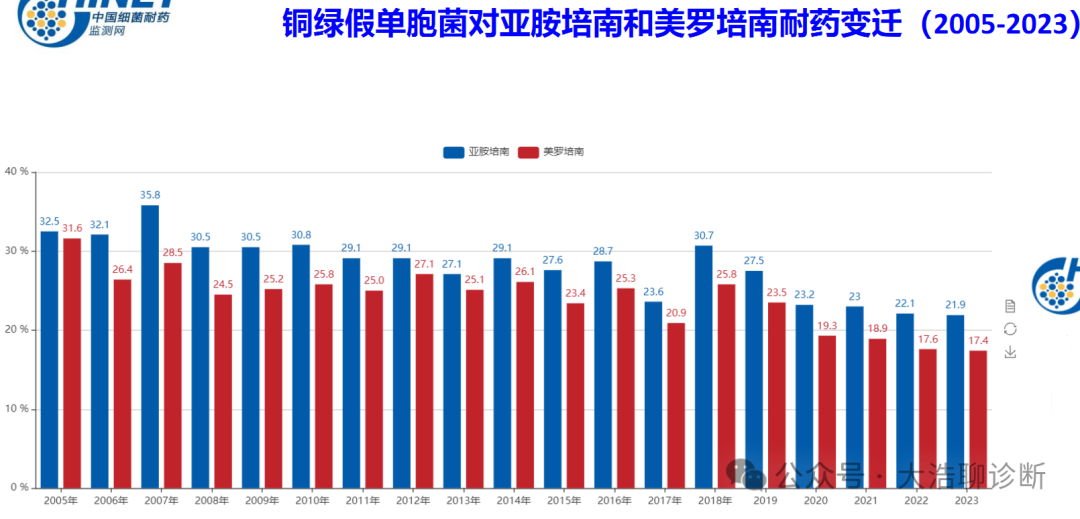 肺炎克雷伯菌和铜绿假单胞菌对于亚胺培南和美罗培南耐药情况或持平或略有升高分别来到KP(24.8%、26%)、PA(21.9%、17.4%)
