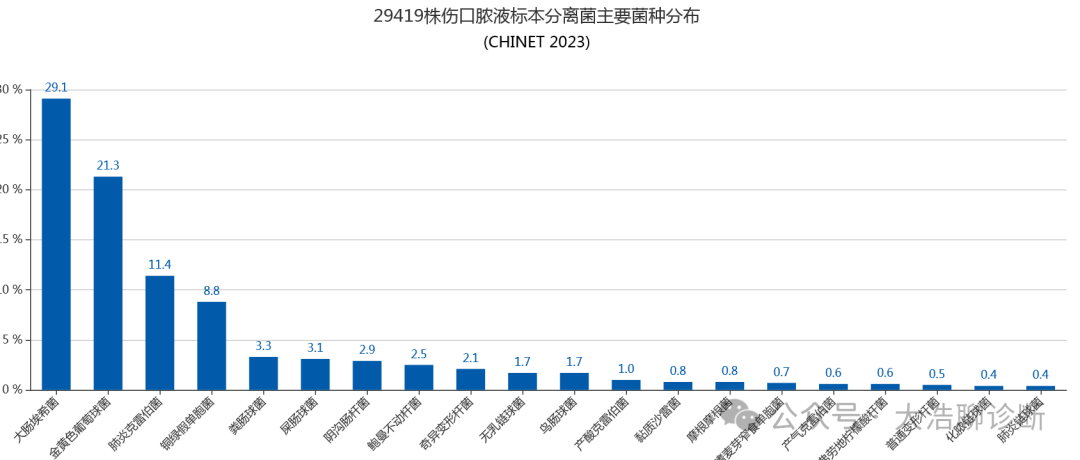 在中国VRE主要病原为屎肠球菌。CHINET数据来看血液标本(4.5%)、泌尿道标本(9.6%)、伤口脓液标本(3.3%)等分离出屎肠球菌比例较高,而呼吸道标本则占比很低(0.3%)。
