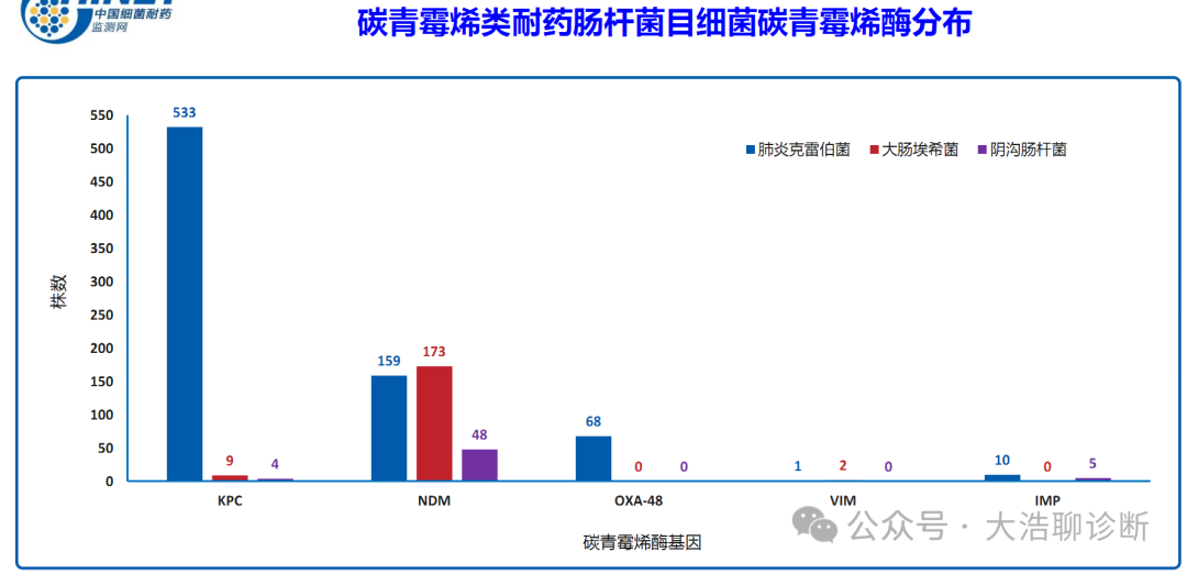 关于CRE,本次则给出了常见肠杆菌的肺炎克雷伯、大肠埃希氏菌以及阴沟肠杆菌关于碳青霉烯酶的分布情况,其中KPC、NDM分布率较高其具有检测价值。