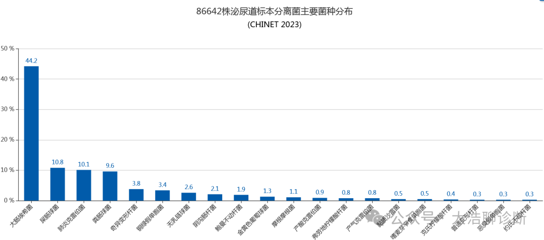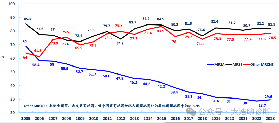 MRSA的比例持续上升,在经历疫情期间的3年小幅度下跌后,2023年MRSA重新增长的比例来到29.6%,这值得关注。