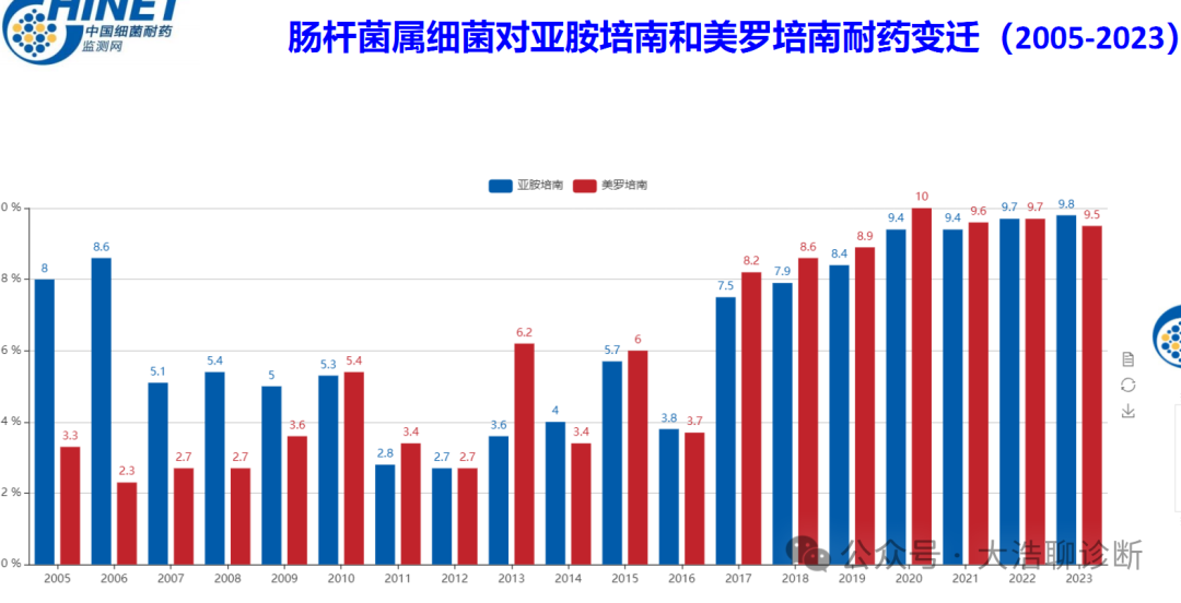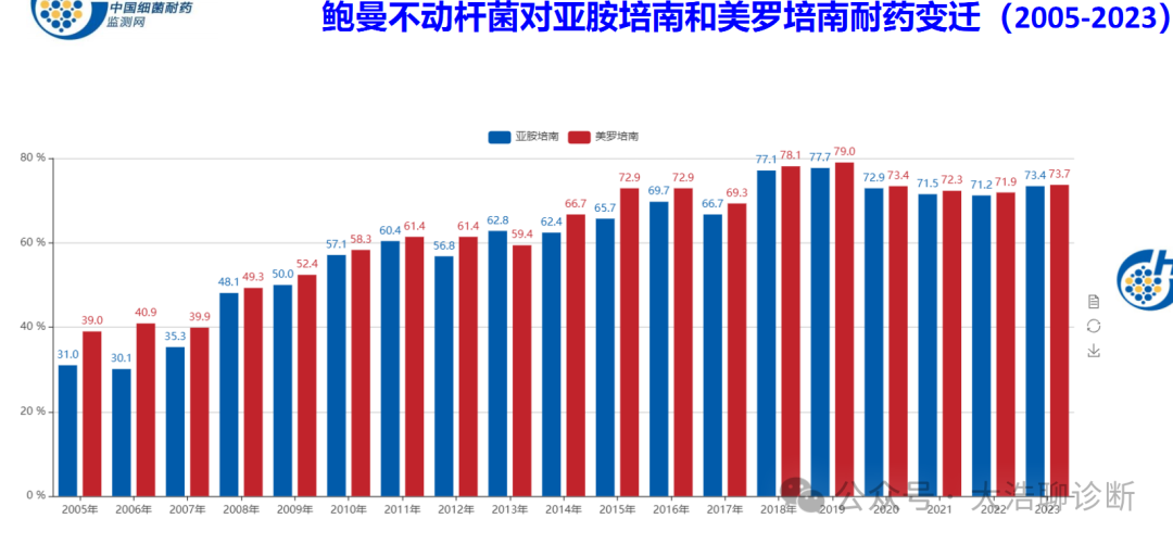 针对G-常见的鲍曼不动杆菌的耐药情况比例依旧超级高,其对亚胺培南和美罗培南的耐药率略有上升来到73.4%与73.7%