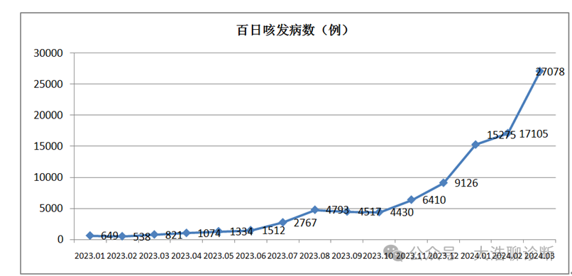 进入2024年百日咳发病数是每月都在有大幅度增加,1月份1.5万人至2月份1.7万人再到3月2.7万人,且2024年1-3月相较于2023年同期发病率倍数是23、31、32倍。更值得关注的是有很多成年人因为轻症未就诊的情况,或有些地区还未开展百日咳的实验室检测,若此百日咳发病数只会更高。