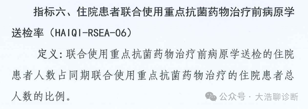 医院感染管理医疗质量控制指标指标六再次提出要关注联合使用抗菌药物前病原学送检率。若不进行病原学送检,仅使用经验性得抗菌药物,一旦治疗无效,临床就无法动态进行药物调整。