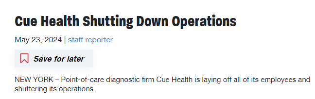 作者:上海滩老纪 人无千日好,花无百日红。这是经验,也是事物发展的规律。 上海有个区块叫“前滩”,2018年首个需要“摇号”的楼盘开始销售,3000+的购房者来抢400+房子,红极一时。 可当这个区块的最后一个楼盘开始认筹时,已经秋风萧瑟,门可罗雀。从无名之辈到上海之巅,再到神话破灭,此中变化,不过数年。 这样的规律也同样发生在分子POCT公司身上。 2021年,Cue Health横空出世,惊艳众人。彼时,纳斯达克敲钟上市,红旗招展,锣鼓喧天。可是才过去3年,Cue Health就关门歇业了! 就在上周,当看到FDA对于Cue Health发出警告信的时候,大概知道Cue Health 命不久矣了,《又遭暴击,分子POCT曾经的明星企业,如今岌岌可危!》 可还是没想到,“关门”来得这么快! 就在昨天,5月23号,360Dx 新闻:Cue Health 宣布解雇全部雇员,停止运营。 4月份,FDA驳回Cue Health 对于合胞病毒RSV试剂批准的申请。 5月份,FDA发布的关于Cue Health 试剂变更没有获得批准的警告信,FDA建议暂停销售。 FDA动动手指头,完成了对Cue Health的绝杀。 公司负债累累,短时间又没有现金流,除了关门,Cue Health 已经没有选择了。本来还想靠49%的裁员力度,缓口气,苟延残喘一下,可顶不住,一了百了,早死早超生。 Cue Health,再见! 看到Cue Health关门,心中感慨万千,明明与我没有半毛钱关系,可还是忍不住惋惜。 从2021年开始,我就一直在关注Cue Health了。IVD工具人公众号,就是从报道 Cue Health开始获得大家关注的。 2021年4月1日《FDA新冠抗原检测新增2家OTC》第一次报道了Cue。当时它是FDA批准的第一个To C 的核酸检测试剂。 因为Cue Health没有出原理讲解的视频,在学习了他们的专利后,我用小乐高做了一个定格动画,来演示Cue的反应原理。 视频的最后,是2021年的老纪,那时才刚刚开始做公众号,三年过去了,公众号还在,可Cue Health没了。 Cue Health 成立于2010年,到2021年上市的时候,已经做了10年了,融资总额据说到了10亿美元,IPO当日收盘的市值29亿。 可惜,出道即巅峰!此后股价便是一路下行,再也没有回到过IPO当日的荣光。截至昨天,市值仅剩1427w美元了。 看着这样的股价变化,投资人心里一万只草泥马奔腾而过。可惜投资人也是肉眼凡胎,只能猜中前头,可是猜不着这结局。 作为旁观者,有这样的一个疑问: To C的分子POCT,是不是没有未来? 虽然在疫情的时候,它们都各领风骚,可随后就萎靡了。Lucira被辉瑞收购;Cue Health 关门;Detect 销声匿迹,也不知道现况如何。 再后来又多了两家获得FDA紧急授权批准的分子POCT产品,Aptitude 和 3EO,但是前路茫茫,不知彼岸在何方?企业还是得靠融资,赞助,和投资存活。Aptitude跟积水诊断合作,报上大腿,才是正确选择。 可以肯定的是,分子POCT不是一个现金流充沛的赛道,企业需要外部的资金续命,直到可以自己造血盈利的那天。 一哥赛沛,1996年成立,截至2015年,20年时间里赛沛累积亏损3.42亿美元,直到2016年被丹纳赫40亿美金收购,才开始脱胎换骨,扭亏为盈。 老美的投资文化还是值得肯定的,赛沛20年亏损,企业还能活,还有资金去支持。Cue Health 十年不赚钱,也等来了风起的时刻。 放在国内,不要说20年,3年不能把饼画圆就有风险,5年不能盈利就可能倒闭。相比之下,外国韭菜相当地耐割。 可如此好的资本环境也没能救Cue Health,我的美好祝愿也落空了。 |