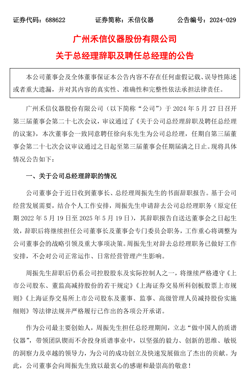 5月27日,广州禾信仪器股份有限公司(以下称“禾信仪器”)发布关于总经理辞职及新任总经理聘任的公告。公告称,禾信仪器董事会于近日收到董事长、总经理周振先生的书面辞职报告。基于公司经营发展需要,结合个人工作安排,周振先生申请辞去公司总经理职务(原定任期2022年5月19日至2025年5月19日),其辞职报告自送达董事会之日起生效,辞职后将继续担任公司董事长及董事会专门委员会职务,工作重心将调整为公司董事会的战略引领及重大事项决策。 经公司董事长周振先生提名,董事会提名委员会资格审查通过,董事会同意聘任徐向东先生为公司总经理,任期从董事会审议通过之日起至第三届董事会任期届满之日止。 公告原文: |