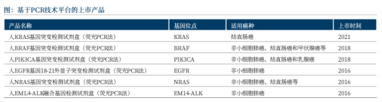 雅康博深耕PCR分子诊断领域多年,位于行业领先地位。基于实时荧光定量PCR平台,公司自主研发了佰康安系列产品。截至目前,公司布局的产品线充足,已有EGFR、ALK 、BRAF 、PIK3CA 、NRAS 、KRAS 共6款PCR试剂盒产品获NMPA 批准,覆盖丰富的癌种包括肺癌、结直肠癌、甲状腺癌和乳腺癌。