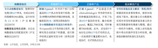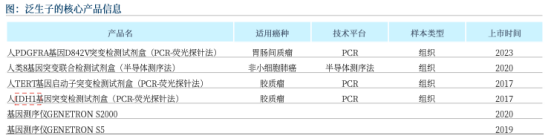 公司已有8款肿瘤IVD 产品(其中6款为三类证)获国家药品监督管理局批准并上市,包括用于脑肿瘤诊断分型的IDH1和TERT 试剂盒、用于肺癌靶向药选择的肺癌8基因试剂盒、用于胃肠间质瘤靶向药物阿伐替尼片的伴随诊断试剂盒、高通量测序仪S5及S2000等。