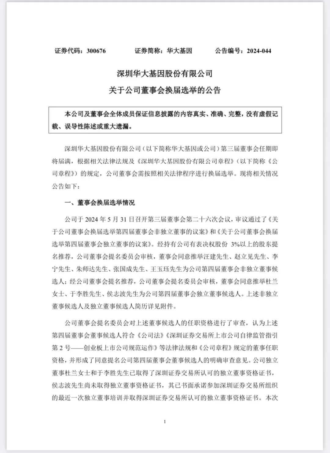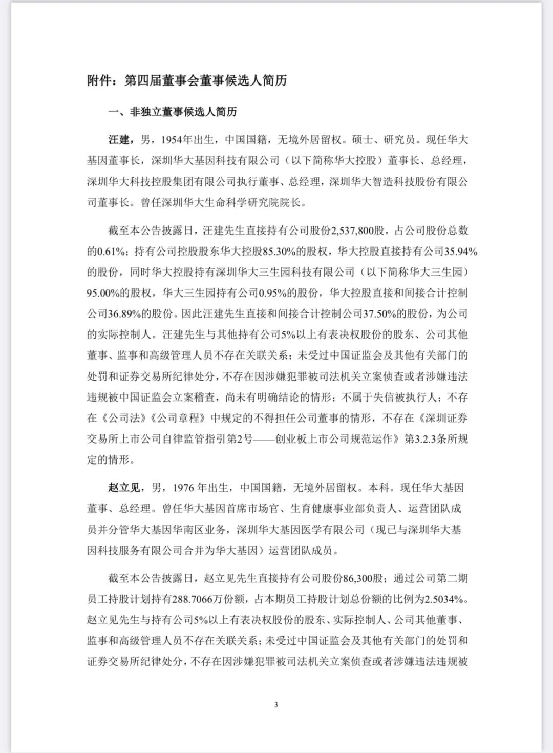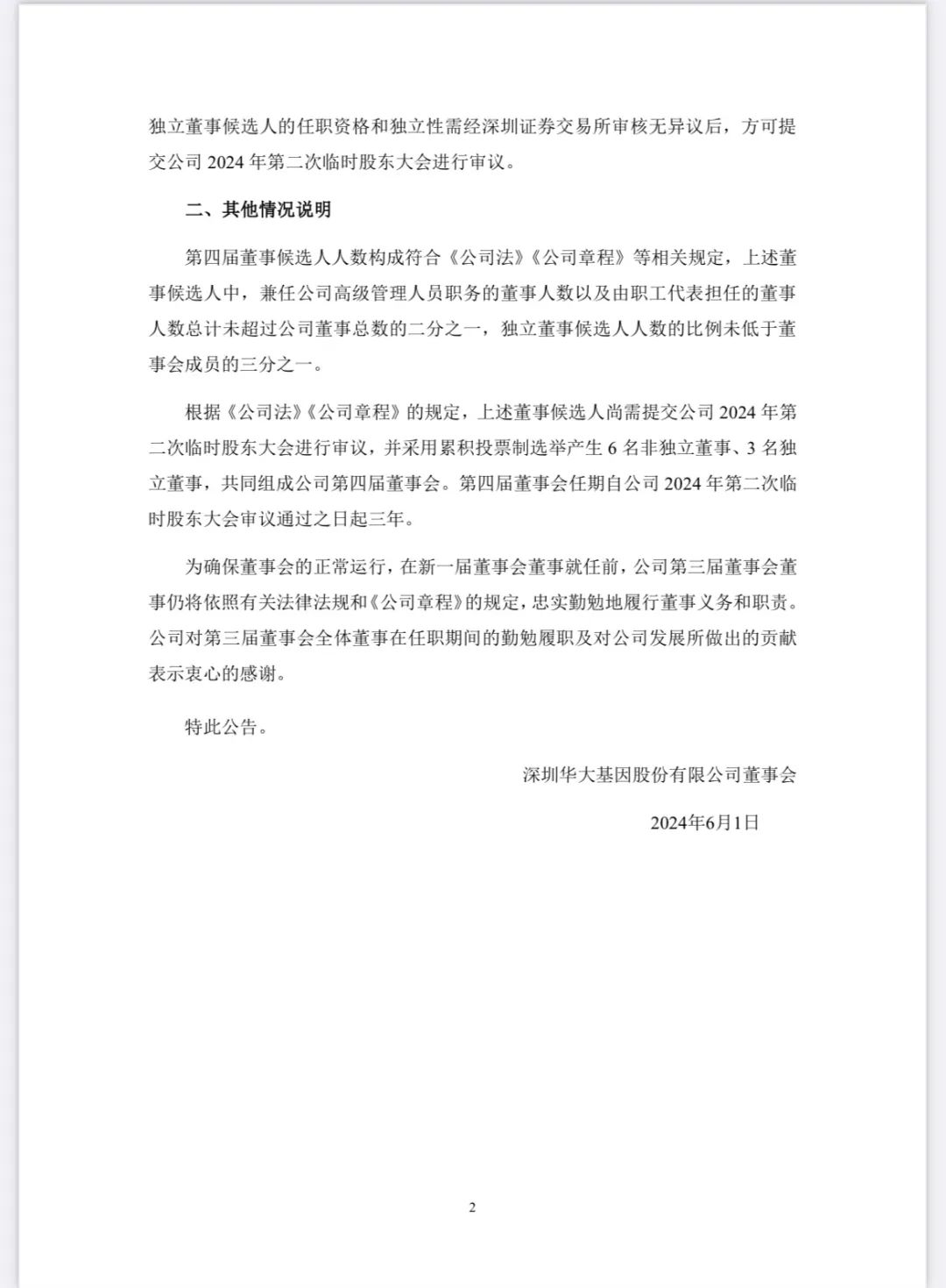 华大基因于2024年5月31日召开第三届董事会第二十六次会议,审议通过了《关于公司董事会换届选举第四届董事会非独立董事的议案》和《关于公司董事会换届选举第四届董事会独立董事的议案》。经持有公司有表决权股份3%以上的股东提名推荐,公司董事会提名委员会审核,董事会同意推举汪建先生、赵立见先生、李宁先生、朱师达先生、张国成先生、王玉珏先生为公司第四届董事会非独立董事候选人:经公司董事会提名推荐,公司董事会提名委员会审核,董事会同意推举杜兰女士、于李胜先生、侯志波先生为公司第四届董事会独立董事候选人。 |