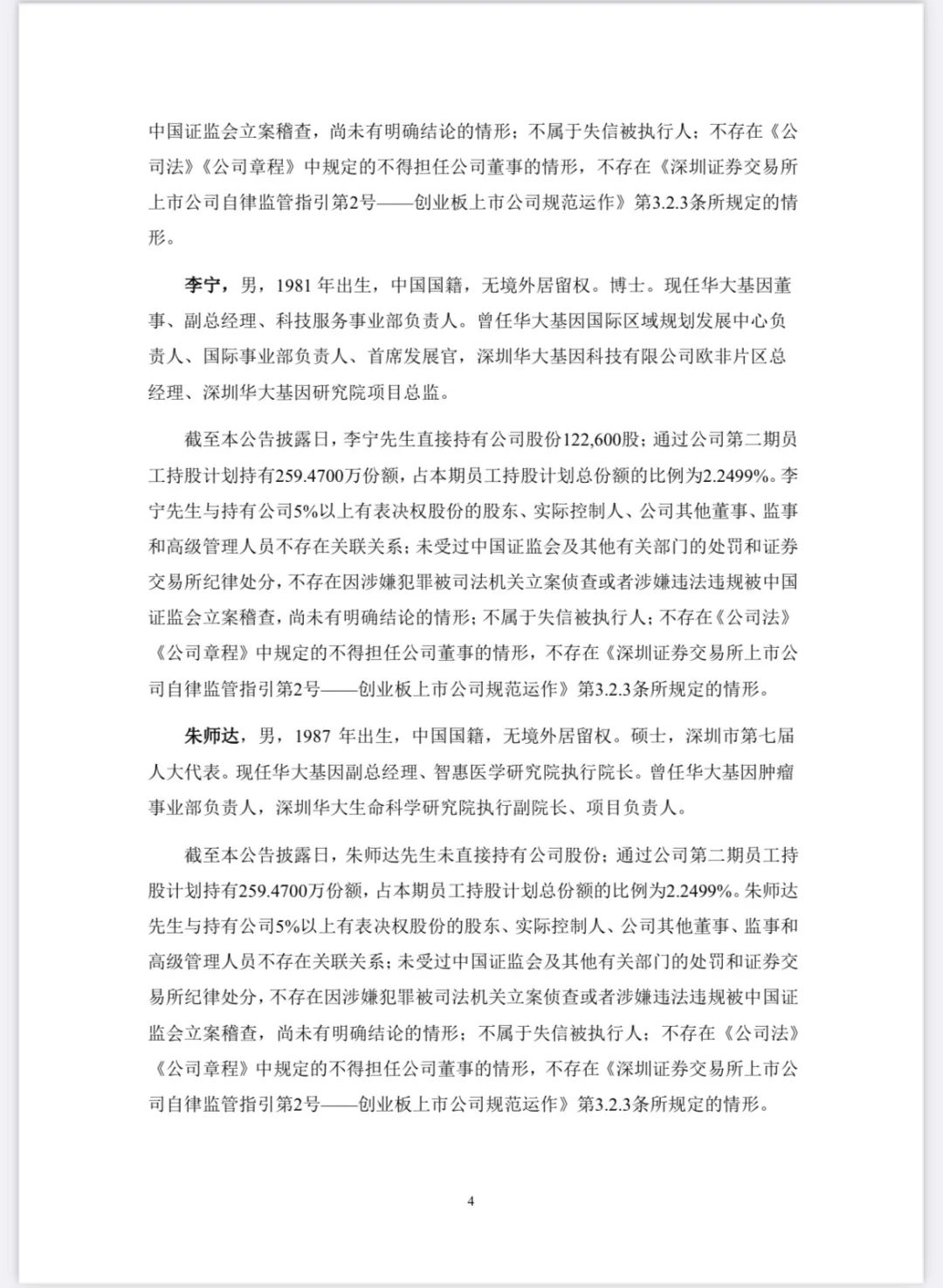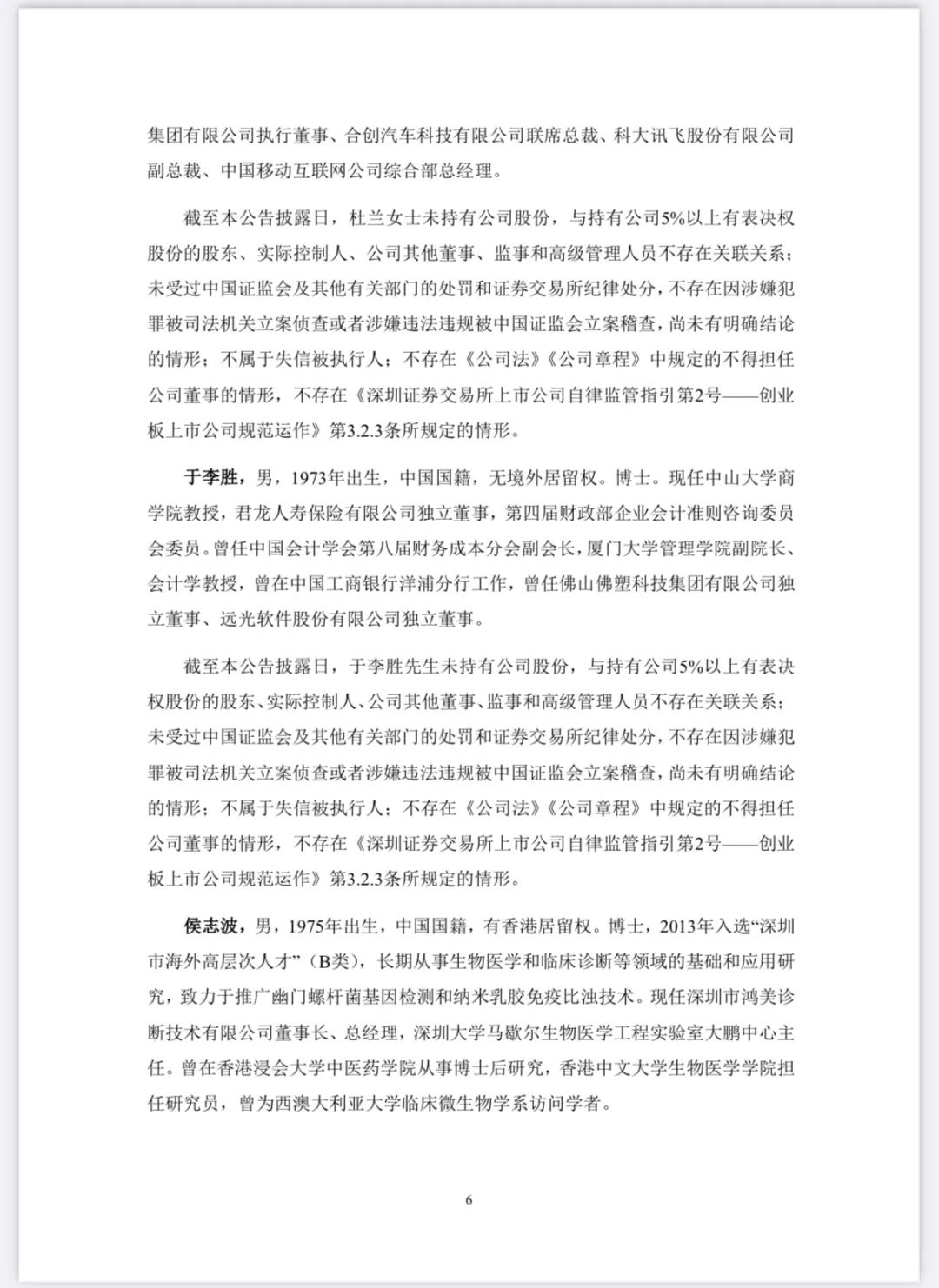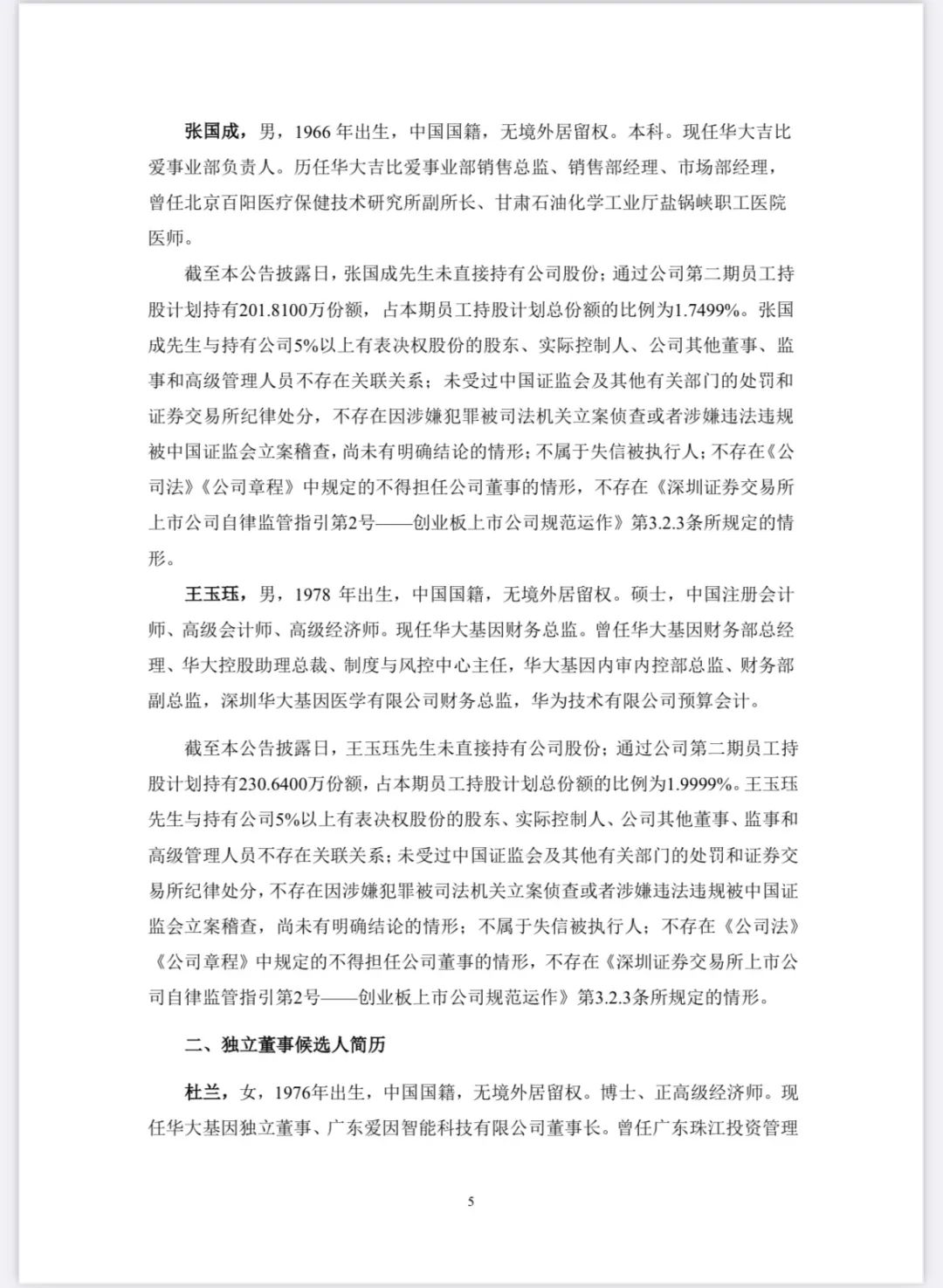 华大基因于2024年5月31日召开第三届董事会第二十六次会议,审议通过了《关于公司董事会换届选举第四届董事会非独立董事的议案》和《关于公司董事会换届选举第四届董事会独立董事的议案》。经持有公司有表决权股份3%以上的股东提名推荐,公司董事会提名委员会审核,董事会同意推举汪建先生、赵立见先生、李宁先生、朱师达先生、张国成先生、王玉珏先生为公司第四届董事会非独立董事候选人:经公司董事会提名推荐,公司董事会提名委员会审核,董事会同意推举杜兰女士、于李胜先生、侯志波先生为公司第四届董事会独立董事候选人。 |