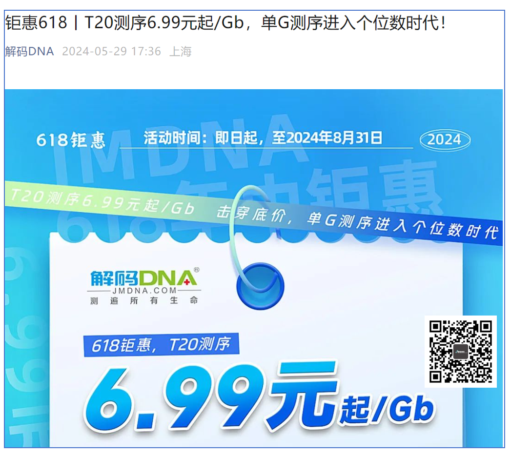2024年5月29日,解码DNA发布了一个公告NGS测序价格降到了6.99元/Gb。 在美国人民还在4美元/Gb的时候,中国人民就只需要1美元不到了。 4美元不孬,6.99人民币更好。 当然,也需要一点点的代价,那就是要1T起订,3天交付。 那么有人要说了,人家Onso是Q40,交付只需要48小时,你们这也不行啊。 朋友,你是不是忘了人家还有华大智造的DNBSEQ-T7啊。。。 同样Q40,交付只需要22个小时左右。 噢,对了,服务的价格都不需要4美元... (由于没给广告费,就不放联系方式了) 这里面,有个可以探讨的问题。 这么低的测序价格下,我们的不同测序方案未来将会走向何方?