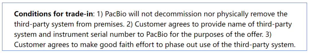 噢对了,PacBio明确表示不这个所谓的“Trade-in”并不会物理意义上的去搬走客户原有的测序仪,只需要提供序列号就行。 美帝良心啊... 甚至,PacBio贴心的表示,您只要同意“诚信”的努力逐步停止使用第三方系统就行了。 热泪盈眶... 根据网址推测,这个项目是2024年5月21日上线。