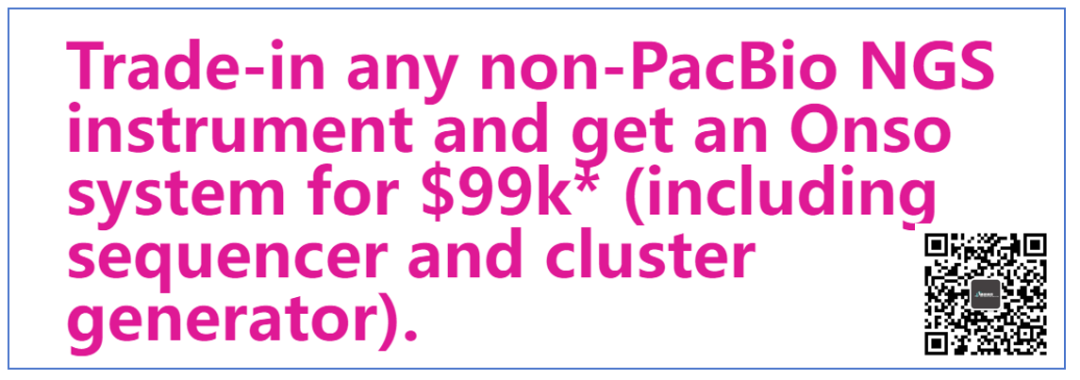 PacBio表示,嘿Bro,你的NGS测序仪过时了,现在9.9万美元就能换台新的PacBio Onso测序仪。 对,连Cluster Generator(簇生成器,类似曾经Illumina的cBOT)一起的价格噢。 那么,代价是什么?