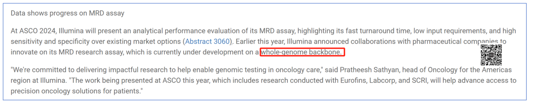比如,我们可以看Illumina今年ASCO的一个poster就是讲做MRD(微小残留病灶)研究用WGS来筛选患者特定的突变位点来进行跟踪是更为合适的。