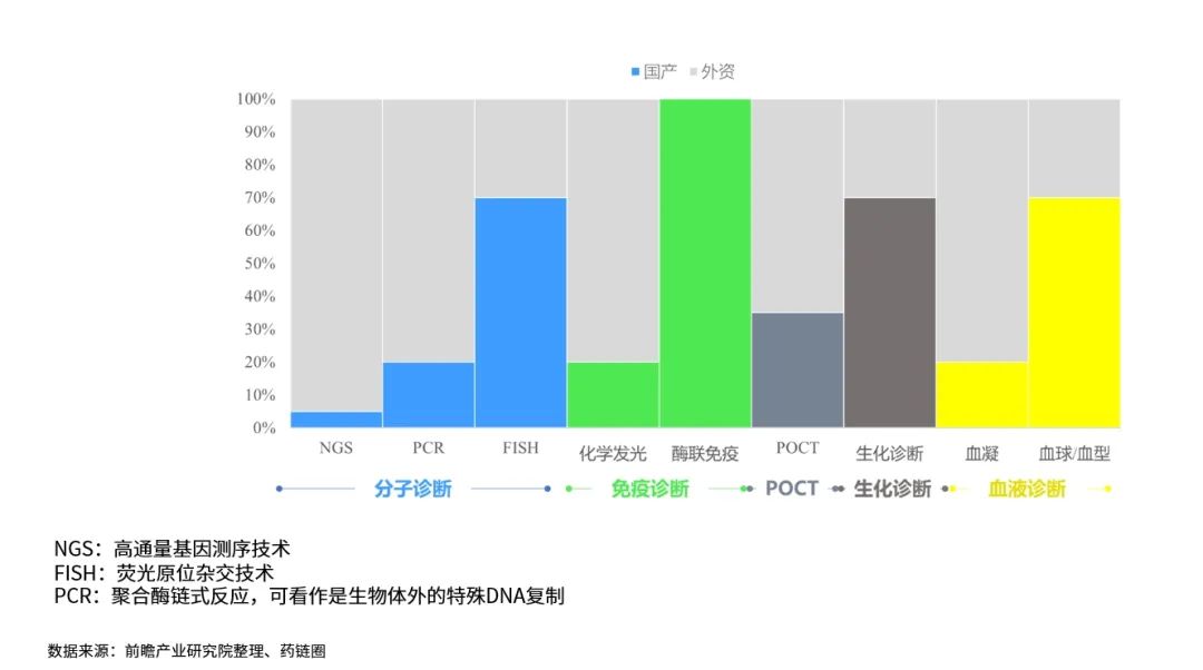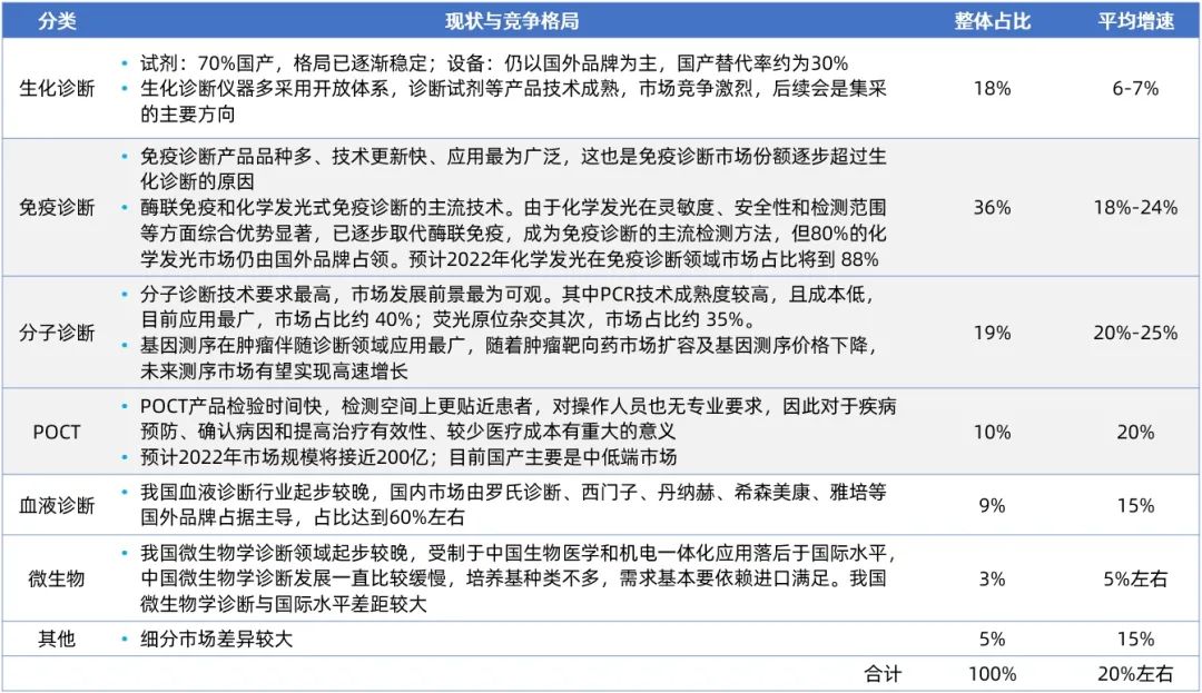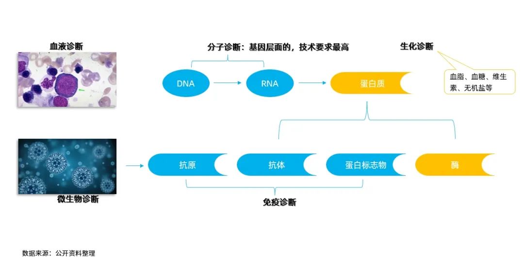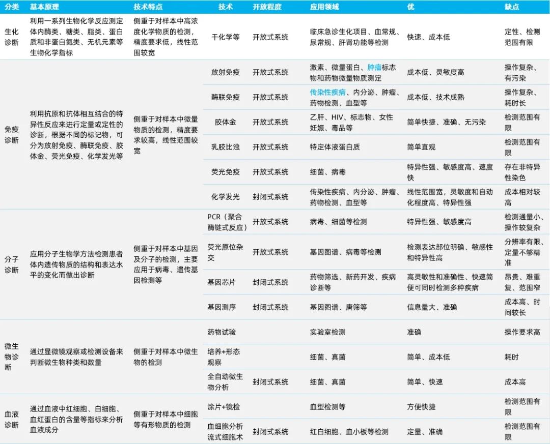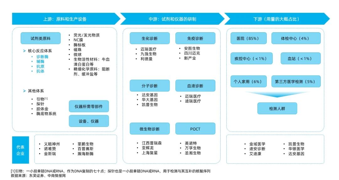 体外诊断(In Vitro Diagnostics,简称为IVD)目前在临床上的使用率极高,约有80%的疾病诊断依靠体外诊断,所以被称为“医生的眼睛”。体外诊断能够为医生治疗方案及用药提供重要参考指标,是保证人类健康的医疗体系中不可或缺的一环。2021年国内体外诊断市场已达到千亿的规模,随着人口老龄化和健康意识的不断增长,国内体外诊断市场规模将进一步扩大。 定 义 体外诊断:指将样本(血液、体液、组织等)从人体中取出后进行检测,通过与正常人的分布水平相比较,来确定病人相应的功能状态和异常情况,以此来作为诊断和治疗的依据。即在体外通过对人体体液、细胞和组织等样本进行检测而获取临床诊断信息,进而判断疾病或机体功能的产品和服务,目前在临床上的使用率极高,约有80%的疾病诊断依靠体外诊断,所以被称为“医生的眼睛”。 分 类 一般按检测原理或检测方法主要分为生化诊断、免疫诊断、分子诊断、微生物诊断和血液诊断五大类。 ▼ 体外诊断的分类 体外诊断细分按检测对象不同,区别比较显著。 ▼ 不同体外诊断类别的检测对象 按照搭配试剂方式的不同,体外诊断仪器可分为开放式系统、封闭式系统和半封闭系统:开放式系统使用的检测试剂与仪器不存在专业性限制,同一系统可适用于不同厂家的试剂;封闭式系统需要搭配专属试剂才能完成检测,即同一厂家的仪器和试剂必须配套使用;半封闭式诊断仪器的部分检测项目是封闭式的,部分检测项目是开放式的。 按检测环境及条件的不同,体外诊断又分为实验室诊断和床旁诊断或即时诊断(Point of care testing,POCT)。POCT是指利用便携式分析仪器或配套试剂在采样现场进行快速检测得到结果的一种方式,以其“便携性、操作简便性、结果及时性”等优势得到了快速发展和应用。 生化诊断、免疫诊断和分子诊断分别针对代谢物、蛋白质和遗传物质(如核酸),分别侧重已发生疾病、已感染疾病的检测及发病基因的检测。三者覆盖不同阶段生命过程,呈互补关系。POCT则强调检测时间和地点的及时性,应用场景更为丰富。其实我们熟知的核酸检测,它检测的物质就是病毒的核酸。核酸检测是查找人体的呼吸道标本、血液中是否存在外来入侵病毒的核酸,来确定是否被新冠病毒感染。核酸检测本来是指一大类关于分子诊断的检测方法,现在被狭义理解为新冠病毒的核酸检测。 市场规模 全球方面,2020年全球体外诊断市场规模约834亿美元,2017-2019年行业平均增速为5.5%;2020年受疫情影响,对新冠相关的测试需求大幅增加,行业增速提升至15.0%。 ▼ 2016-2020年全球体外诊断市场规模(亿美元) 国内方面,根据中商研究院的研究数据显示,2021年国内体外诊断市场规模达1243亿,同比增长19%,其余年份保持20%左右的增速,增速高于全球市场。 ▼ 2016-2021年国内体外诊断市场规模(亿元) 竞争格局 国内体外诊断行业市场竞争格局“4+X”:外资企业占据了主导地位,罗氏、雅培、西门子、丹纳赫等外资企业市场占比较大,市场竞争较为激烈,形成“4+X”格局。从现有2018年的数据来看,前五的均为外资,市场占比累计达55%。 ▼ 国内体外诊断市场竞争格局(2018年) 中高端技术领域仍以外资产品为主导,存在较大替代空间。国产品牌在NGS、化学发光、POCT等领域替代率较低,而在酶联免疫、生化诊断(主要为试剂)等项目上有较高的替代率。如免疫诊断的酶联免疫技术产品基本实现国产替代,生化诊断、血液诊断的血球/血型检测、分子诊断的荧光原位杂交(FISH)技术产品等国产化率均达到70%。 ▼ 国内体外诊断行业细分领域竞争情况 ▼ 体外诊断产业链全景图 产业链分析 体外诊断的上游主要是原材料,广义上包括用于制备体外诊断试剂的生物活性/非生物活性材料,以及研制体外诊断设备所需的零部件。IVD试剂原料指用于生化、免疫或分子诊断等试剂的反应体系原料,主要指核心反应体系,其中的抗原抗体占比达到了48%,酶和底物占比29%。IVD试剂成本的60%-80%是包括诊断酶、抗原和抗体在内的诊断试剂原料。 2021年IVD原料市场规模122亿元,近5年复合增长率是24%,其中进口规模107亿元,占比87.7%,IVD原料仍由进口主导,属于卡脖子的环节。但进口占比呈逐年下降趋势,且国产整体增速是快于进口的,国产替代在加速。 ▼ 2016-2021中国IVD原料市场规模(亿元) 中游为试剂和仪器的研制企业,目前国际巨头基本同时具备生产诊断试剂和仪器的能力,而国内企业囿于发展时间与技术水平,尚以生产试剂为主,具备实力研发高端设备的企业较少即仪器仍以进口为主,且开放式系统占主流,但封闭式系统是趋势,试剂国产替代程度高。 从细分领域来看,生化诊断领域竞争激烈,免疫诊断、分子诊断进口替代空间大,POCT格局相对分散,未来发展潜力大,微生物、血球、凝血相对小众。 ▼ 中国体外诊断细分领域市场现状与竞争格局 下游体外诊断服务市场规模已超3000亿元,医院检验科一直以来是采购量最大的主要客户,但在医疗改革和医保控费政策下,医院基于成本压力逐渐将检测业务外包给第三方检测机构或通过医联体来实现规模效应,促进了第三方检测机构在过去几年的快速发展,使之成为体外诊断下游重要的新兴力量。 第三方医学检验隶属于“医疗服务”行业中的“医学诊断服务”细分行业, 是依托独立医学实验室(ICL)为各类医疗机构提供医学检验及诊断外包的