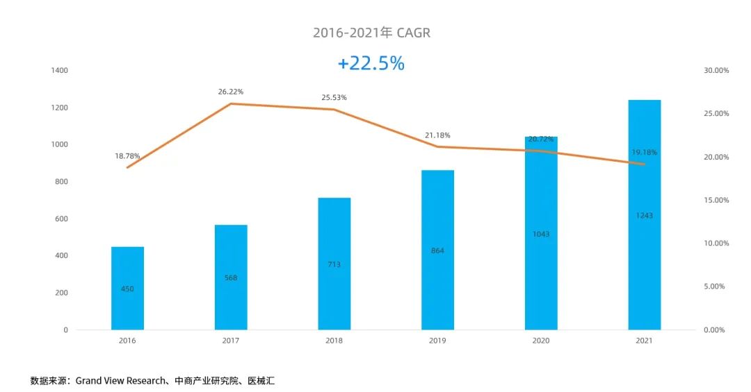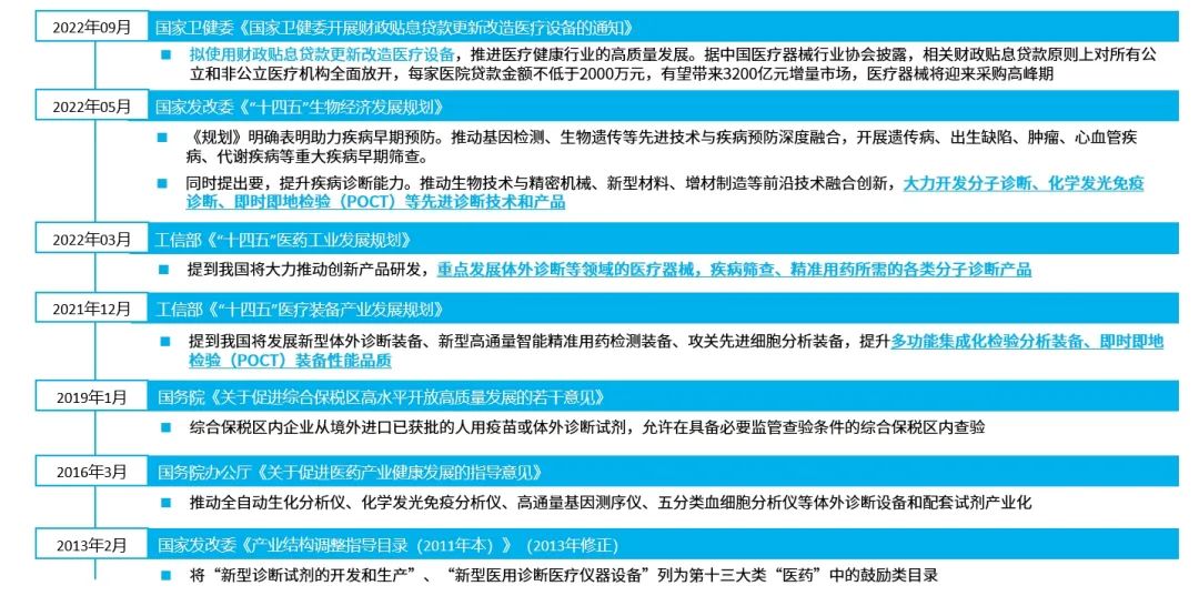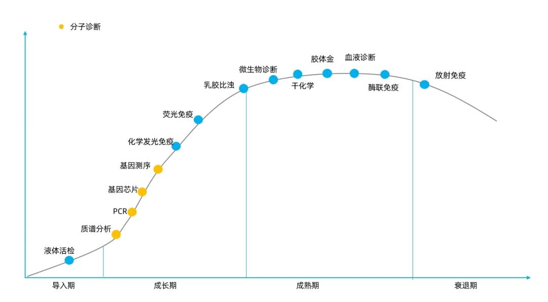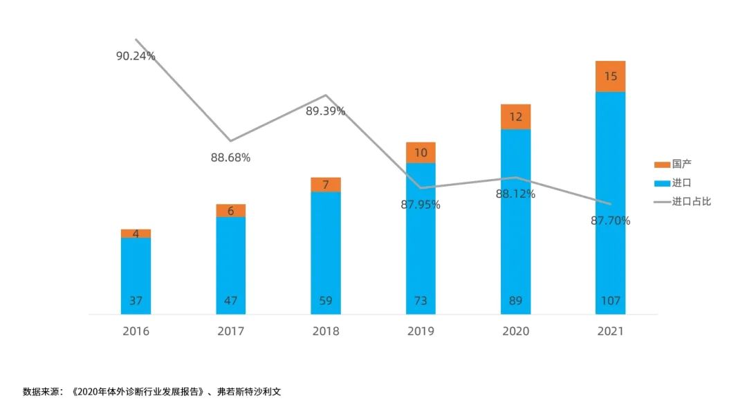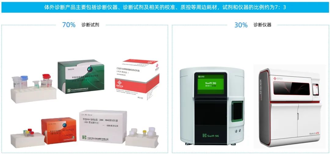 体外诊断(In Vitro Diagnostics,简称为IVD)目前在临床上的使用率极高,约有80%的疾病诊断依靠体外诊断,所以被称为“医生的眼睛”。体外诊断能够为医生治疗方案及用药提供重要参考指标,是保证人类健康的医疗体系中不可或缺的一环。2021年国内体外诊断市场已达到千亿的规模,随着人口老龄化和健康意识的不断增长,国内体外诊断市场规模将进一步扩大。 定 义 体外诊断:指将样本(血液、体液、组织等)从人体中取出后进行检测,通过与正常人的分布水平相比较,来确定病人相应的功能状态和异常情况,以此来作为诊断和治疗的依据。即在体外通过对人体体液、细胞和组织等样本进行检测而获取临床诊断信息,进而判断疾病或机体功能的产品和服务,目前在临床上的使用率极高,约有80%的疾病诊断依靠体外诊断,所以被称为“医生的眼睛”。 分 类 一般按检测原理或检测方法主要分为生化诊断、免疫诊断、分子诊断、微生物诊断和血液诊断五大类。 ▼ 体外诊断的分类 体外诊断细分按检测对象不同,区别比较显著。 ▼ 不同体外诊断类别的检测对象 按照搭配试剂方式的不同,体外诊断仪器可分为开放式系统、封闭式系统和半封闭系统:开放式系统使用的检测试剂与仪器不存在专业性限制,同一系统可适用于不同厂家的试剂;封闭式系统需要搭配专属试剂才能完成检测,即同一厂家的仪器和试剂必须配套使用;半封闭式诊断仪器的部分检测项目是封闭式的,部分检测项目是开放式的。 按检测环境及条件的不同,体外诊断又分为实验室诊断和床旁诊断或即时诊断(Point of care testing,POCT)。POCT是指利用便携式分析仪器或配套试剂在采样现场进行快速检测得到结果的一种方式,以其“便携性、操作简便性、结果及时性”等优势得到了快速发展和应用。 生化诊断、免疫诊断和分子诊断分别针对代谢物、蛋白质和遗传物质(如核酸),分别侧重已发生疾病、已感染疾病的检测及发病基因的检测。三者覆盖不同阶段生命过程,呈互补关系。POCT则强调检测时间和地点的及时性,应用场景更为丰富。其实我们熟知的核酸检测,它检测的物质就是病毒的核酸。核酸检测是查找人体的呼吸道标本、血液中是否存在外来入侵病毒的核酸,来确定是否被新冠病毒感染。核酸检测本来是指一大类关于分子诊断的检测方法,现在被狭义理解为新冠病毒的核酸检测。 市场规模 全球方面,2020年全球体外诊断市场规模约834亿美元,2017-2019年行业平均增速为5.5%;2020年受疫情影响,对新冠相关的测试需求大幅增加,行业增速提升至15.0%。 ▼ 2016-2020年全球体外诊断市场规模(亿美元) 国内方面,根据中商研究院的研究数据显示,2021年国内体外诊断市场规模达1243亿,同比增长19%,其余年份保持20%左右的增速,增速高于全球市场。 ▼ 2016-2021年国内体外诊断市场规模(亿元) 竞争格局 国内体外诊断行业市场竞争格局“4+X”:外资企业占据了主导地位,罗氏、雅培、西门子、丹纳赫等外资企业市场占比较大,市场竞争较为激烈,形成“4+X”格局。从现有2018年的数据来看,前五的均为外资,市场占比累计达55%。 ▼ 国内体外诊断市场竞争格局(2018年) 中高端技术领域仍以外资产品为主导,存在较大替代空间。国产品牌在NGS、化学发光、POCT等领域替代率较低,而在酶联免疫、生化诊断(主要为试剂)等项目上有较高的替代率。如免疫诊断的酶联免疫技术产品基本实现国产替代,生化诊断、血液诊断的血球/血型检测、分子诊断的荧光原位杂交(FISH)技术产品等国产化率均达到70%。 ▼ 国内体外诊断行业细分领域竞争情况 ▼ 体外诊断产业链全景图 产业链分析 体外诊断的上游主要是原材料,广义上包括用于制备体外诊断试剂的生物活性/非生物活性材料,以及研制体外诊断设备所需的零部件。IVD试剂原料指用于生化、免疫或分子诊断等试剂的反应体系原料,主要指核心反应体系,其中的抗原抗体占比达到了48%,酶和底物占比29%。IVD试剂成本的60%-80%是包括诊断酶、抗原和抗体在内的诊断试剂原料。 2021年IVD原料市场规模122亿元,近5年复合增长率是24%,其中进口规模107亿元,占比87.7%,IVD原料仍由进口主导,属于卡脖子的环节。但进口占比呈逐年下降趋势,且国产整体增速是快于进口的,国产替代在加速。 ▼ 2016-2021中国IVD原料市场规模(亿元) 中游为试剂和仪器的研制企业,目前国际巨头基本同时具备生产诊断试剂和仪器的能力,而国内企业囿于发展时间与技术水平,尚以生产试剂为主,具备实力研发高端设备的企业较少即仪器仍以进口为主,且开放式系统占主流,但封闭式系统是趋势,试剂国产替代程度高。 从细分领域来看,生化诊断领域竞争激烈,免疫诊断、分子诊断进口替代空间大,POCT格局相对分散,未来发展潜力大,微生物、血球、凝血相对小众。 ▼ 中国体外诊断细分领域市场现状与竞争格局 下游体外诊断服务市场规模已超3000亿元,医院检验科一直以来是采购量最大的主要客户,但在医疗改革和医保控费政策下,医院基于成本压力逐渐将检测业务外包给第三方检测机构或通过医联体来实现规模效应,促进了第三方检测机构在过去几年的快速发展,使之成为体外诊断下游重要的新兴力量。 第三方医学检验隶属于“医疗服务”行业中的“医学诊断服务”细分行业, 是依托独立医学实验室(ICL)为各类医疗机构提供医学检验及诊断外包的