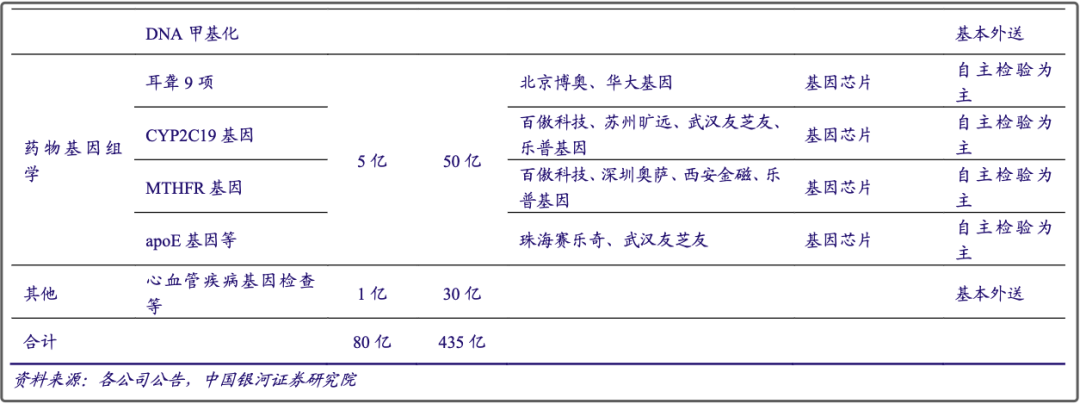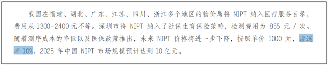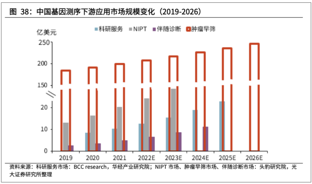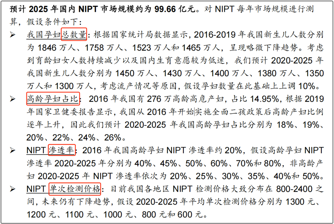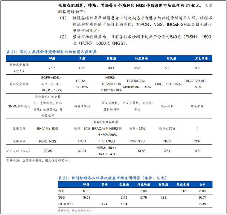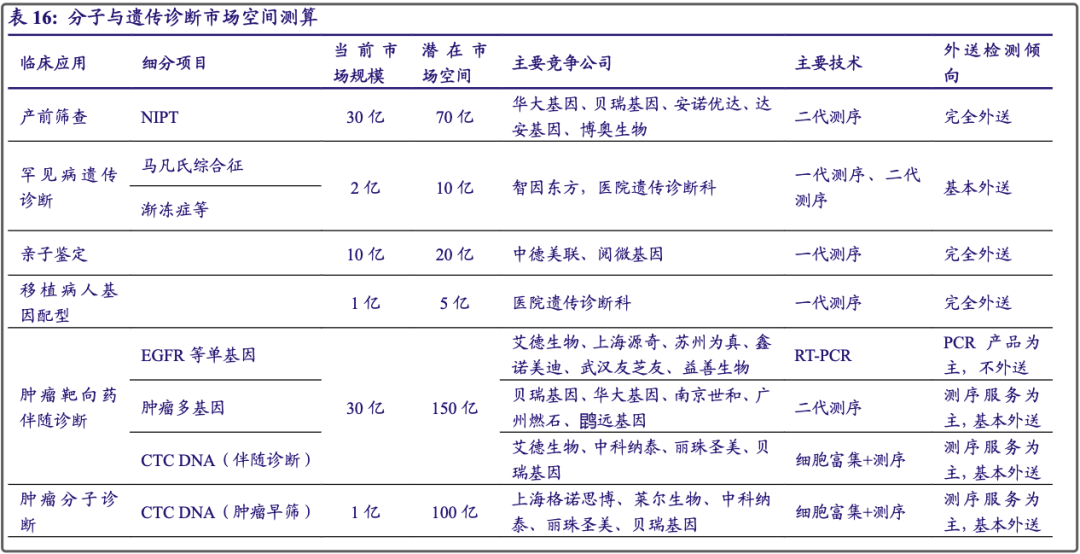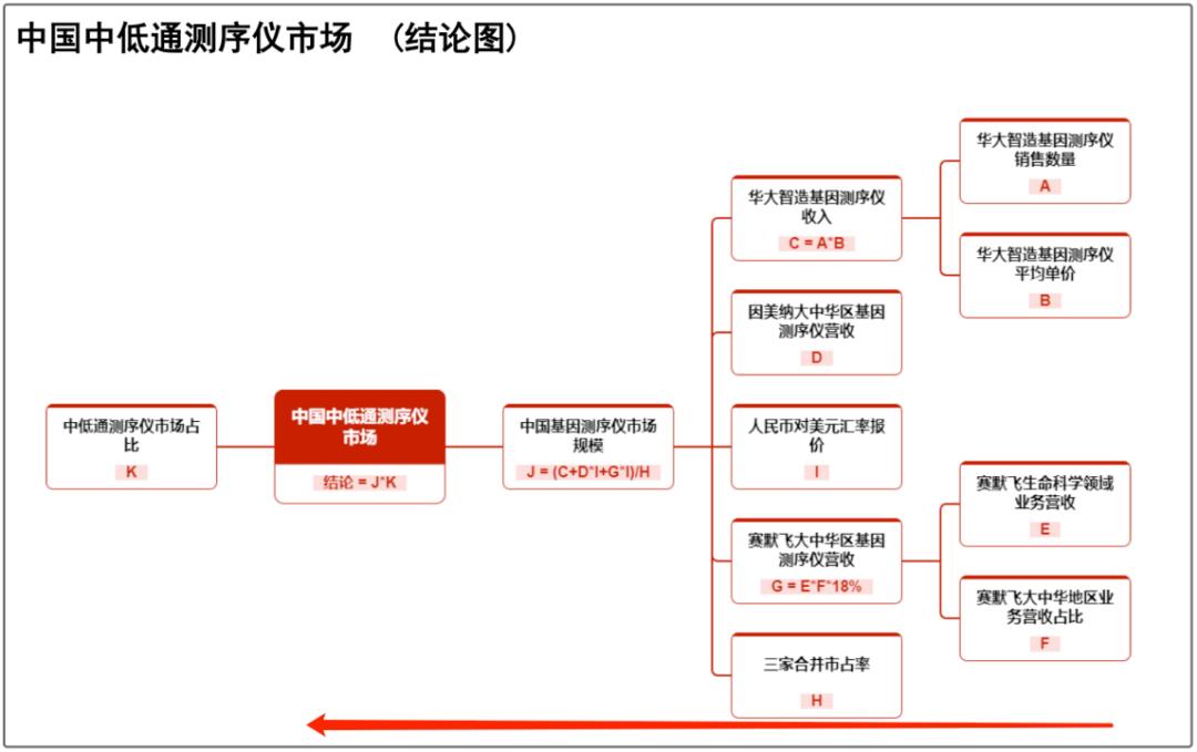 这些关于千亿市场规模的想象,少数被证实,大多被证伪。或者不能说“证伪”,只是前路漫漫,花开彼岸。“千亿市场”是如何被计算出来的?不同的人有不同的逻辑,不同的逻辑计算出来的市场规模往往差异巨大。谁最可信? 我们需要更多的交叉印证,估算出相对可信的规模数据。本文以常见的研报案例,一方面带大家了解方法论:常见市场规模的计算方法;另一方面,汇总一些研报数据,让大家对各赛道的市场规模,有个初步印象。市场规模(Market Size),即市场容量,市场规模主要是研究目标产品或行业的整体规模。企业在产业链上的角色不同,其测算市场规模的方式也不同,如,以终端价计、还是出厂价计。最终选择何种方法,要取决于测算的目的。根据产品的目标人群需求出发,测算目标市场规模。这是我们最常用的方法。NIPT市场规模 = 孕妇总数量 * NIPT渗透率 * NIPT单价中国NIPT市场的市场规模测算(国元证券,2020):(提示:2020的研报,预测数据与真实数据已有很大偏差,我们只关注计算逻辑,不关注具体数值,下同。)(1)孕妇总数量根据国家统计局每年披露的新生儿数值进行估算;(2)根据NIPT的临床检测路径,分为了“高龄孕妇”+“非高龄孕妇”,并分别赋予不同的“渗透率”;(3)NIPT单次检测价格来源官方物价或市场调研;但尽管逻辑合理,但我们也可以从这个案例中“马后炮式”的直观发现,关于“新生儿总数”的估计,大大超过了后续真实情况(1500w vs ~900w);仅此一项关键数据,市场规模的演算就会出现巨大偏差,NIPT渗透率、NIPT检测单价的预测,也会被这种偏差放大。这提示我们,重点关注当下规模和计算逻辑,审慎看待各种预测数据。这是来自另一行研公司关于NIPT的预测数据(2022年):其计算逻辑类似,但大家可以直观看到不同数据源所得出结果的巨大差异。市场总规模 = 细分市场1 + 细分市场2 + 细分市场3....(各细分市场的规模,可采用(1)需求渗透率分解法进行测算。)(1)基于NGS伴随诊断市场规模 = 肺癌NGS市场规模 + 胃癌NGS市场规模 + 肠癌....(2)肺癌伴随诊断市场规模 = 肺癌NGS市场规模 + 肺癌PCR市场规模 + 其他方法学... 中国常见癌种伴随诊断市场规模测算(国元证券,2020):根据癌种、方法学分别进行测算,然后根据需要,进行细分市场结果加和。其最终结果的准确性,要归因于单一细分市场规模的测算准确性。运用此方法测算市场规模,则需要测算者本人在本行业内从事相关工作多年、或经过详细的市场调研,这是对测算者的行业经验要求较高的一个方法。市场规模 = 某品牌的销售额 / 该品牌的市场份额。(其中,销售额往往已知,而市场份额多来源于经验或调研估算。)中国高通量测序仪年出货规模 = MGI年出货规模 / MGI市占率中国中低通量测序仪市场测算(头豹研究院,2024):中国中低通量测序仪市场规模 = [(MGI+Illumina+Thermo国内出货量)/三家合并市占率]*中低通量占比。在这个案例中,根据主要厂家的销售情况去测算总体市场规模,是一个相对准确的计算方式。结果可能的偏差,主要取决于主要厂家的信息披露是否完全,如下,赛默飞的基因测序仪营收,是通过类比测算,估算了一个比例:比如根据“需求渗透率分解法”得出的某一年度的NIPT市场规模,再根据“典型公司反推法”:华大、贝瑞等上市企业披露的数据、市占率推导出来的总市场规模,两种方法交叉印证。如两种方法测算结果近似,则数据可信度较高;如差异巨大,则要细究原因。了解了常见的市场规模测算方法,再来看看2023-2024年各研报中关于各种赛道的估算规模,由大到小:风险提示:股市有风险,投资需谨慎,以上内容仅供投资者参考,不作为投资决策的依据。