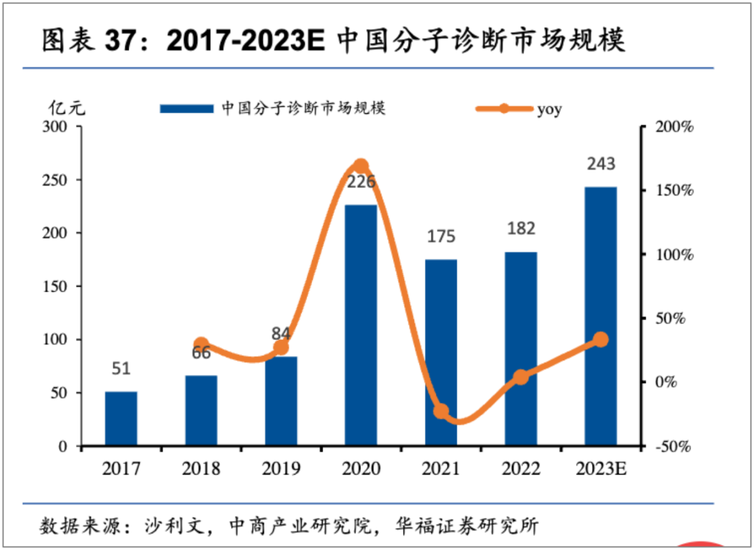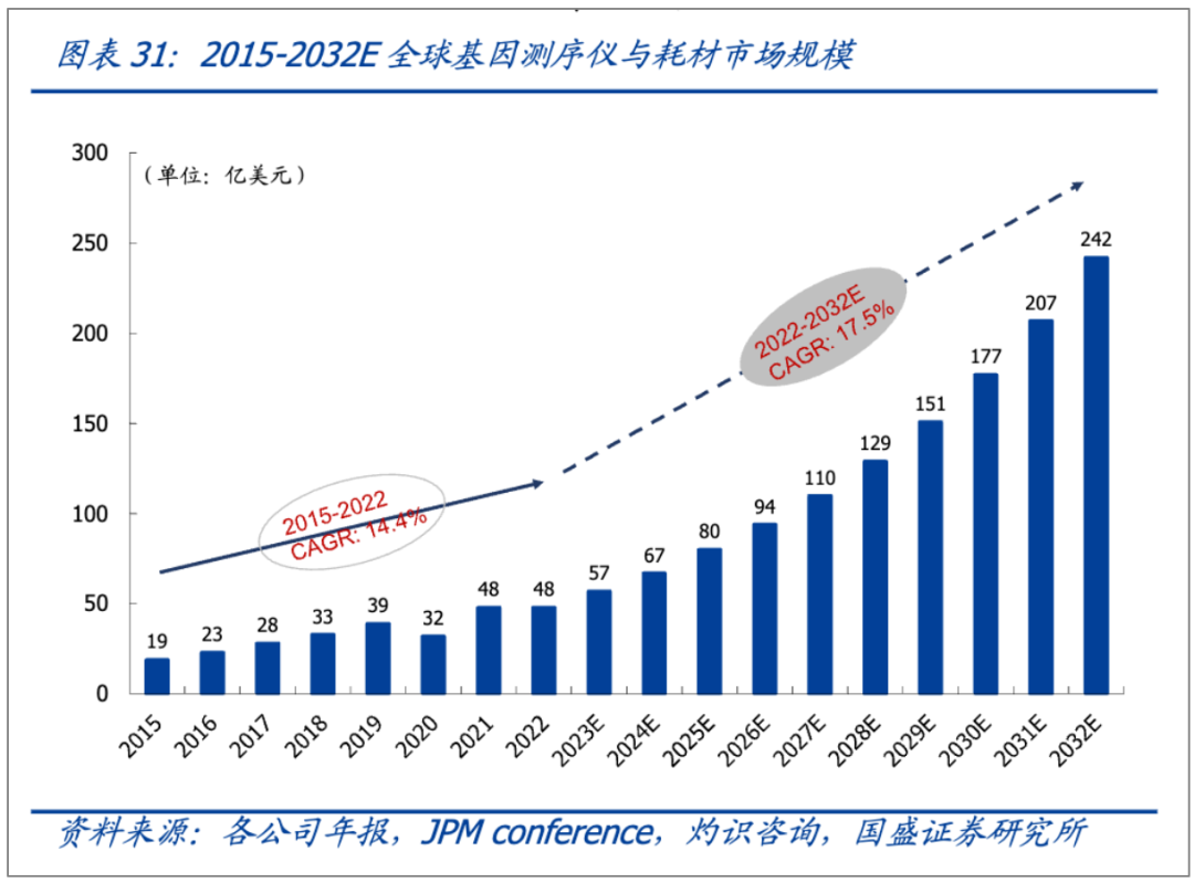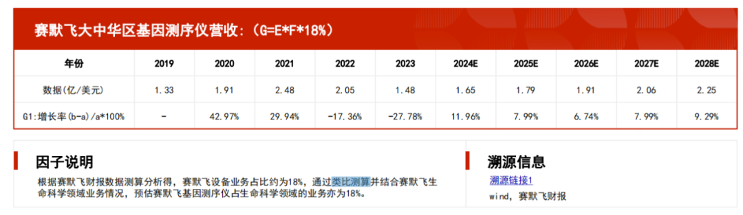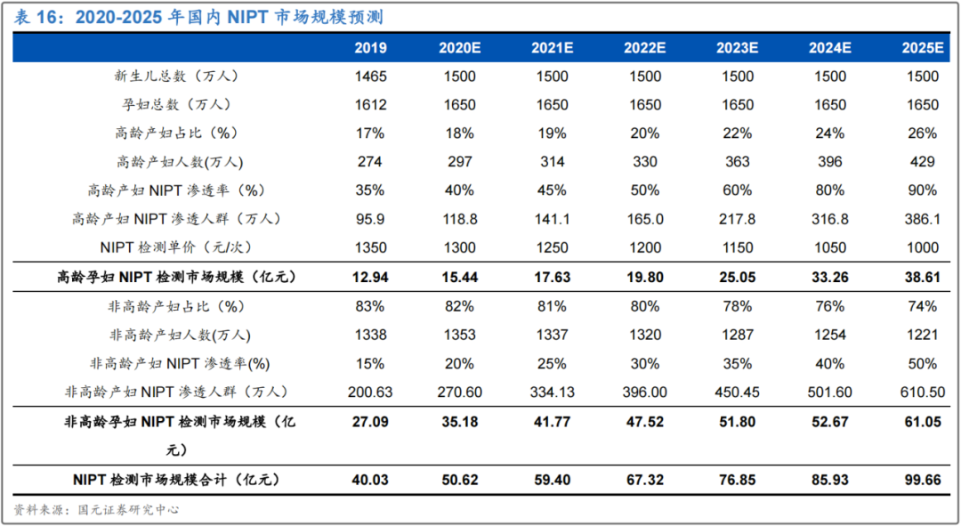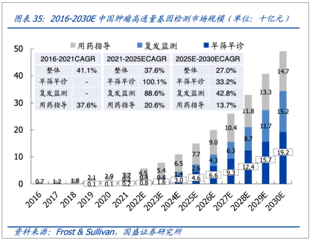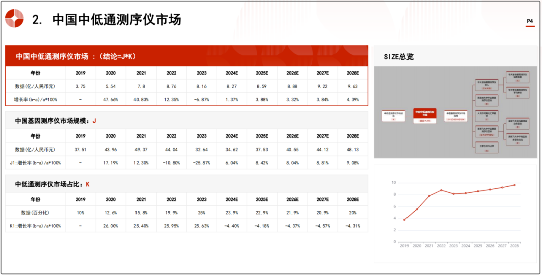 这些关于千亿市场规模的想象,少数被证实,大多被证伪。或者不能说“证伪”,只是前路漫漫,花开彼岸。“千亿市场”是如何被计算出来的?不同的人有不同的逻辑,不同的逻辑计算出来的市场规模往往差异巨大。谁最可信? 我们需要更多的交叉印证,估算出相对可信的规模数据。本文以常见的研报案例,一方面带大家了解方法论:常见市场规模的计算方法;另一方面,汇总一些研报数据,让大家对各赛道的市场规模,有个初步印象。市场规模(Market Size),即市场容量,市场规模主要是研究目标产品或行业的整体规模。企业在产业链上的角色不同,其测算市场规模的方式也不同,如,以终端价计、还是出厂价计。最终选择何种方法,要取决于测算的目的。根据产品的目标人群需求出发,测算目标市场规模。这是我们最常用的方法。NIPT市场规模 = 孕妇总数量 * NIPT渗透率 * NIPT单价中国NIPT市场的市场规模测算(国元证券,2020):(提示:2020的研报,预测数据与真实数据已有很大偏差,我们只关注计算逻辑,不关注具体数值,下同。)(1)孕妇总数量根据国家统计局每年披露的新生儿数值进行估算;(2)根据NIPT的临床检测路径,分为了“高龄孕妇”+“非高龄孕妇”,并分别赋予不同的“渗透率”;(3)NIPT单次检测价格来源官方物价或市场调研;但尽管逻辑合理,但我们也可以从这个案例中“马后炮式”的直观发现,关于“新生儿总数”的估计,大大超过了后续真实情况(1500w vs ~900w);仅此一项关键数据,市场规模的演算就会出现巨大偏差,NIPT渗透率、NIPT检测单价的预测,也会被这种偏差放大。这提示我们,重点关注当下规模和计算逻辑,审慎看待各种预测数据。这是来自另一行研公司关于NIPT的预测数据(2022年):其计算逻辑类似,但大家可以直观看到不同数据源所得出结果的巨大差异。市场总规模 = 细分市场1 + 细分市场2 + 细分市场3....(各细分市场的规模,可采用(1)需求渗透率分解法进行测算。)(1)基于NGS伴随诊断市场规模 = 肺癌NGS市场规模 + 胃癌NGS市场规模 + 肠癌....(2)肺癌伴随诊断市场规模 = 肺癌NGS市场规模 + 肺癌PCR市场规模 + 其他方法学... 中国常见癌种伴随诊断市场规模测算(国元证券,2020):根据癌种、方法学分别进行测算,然后根据需要,进行细分市场结果加和。其最终结果的准确性,要归因于单一细分市场规模的测算准确性。运用此方法测算市场规模,则需要测算者本人在本行业内从事相关工作多年、或经过详细的市场调研,这是对测算者的行业经验要求较高的一个方法。市场规模 = 某品牌的销售额 / 该品牌的市场份额。(其中,销售额往往已知,而市场份额多来源于经验或调研估算。)中国高通量测序仪年出货规模 = MGI年出货规模 / MGI市占率中国中低通量测序仪市场测算(头豹研究院,2024):中国中低通量测序仪市场规模 = [(MGI+Illumina+Thermo国内出货量)/三家合并市占率]*中低通量占比。在这个案例中,根据主要厂家的销售情况去测算总体市场规模,是一个相对准确的计算方式。结果可能的偏差,主要取决于主要厂家的信息披露是否完全,如下,赛默飞的基因测序仪营收,是通过类比测算,估算了一个比例:比如根据“需求渗透率分解法”得出的某一年度的NIPT市场规模,再根据“典型公司反推法”:华大、贝瑞等上市企业披露的数据、市占率推导出来的总市场规模,两种方法交叉印证。如两种方法测算结果近似,则数据可信度较高;如差异巨大,则要细究原因。了解了常见的市场规模测算方法,再来看看2023-2024年各研报中关于各种赛道的估算规模,由大到小:风险提示:股市有风险,投资需谨慎,以上内容仅供投资者参考,不作为投资决策的依据。