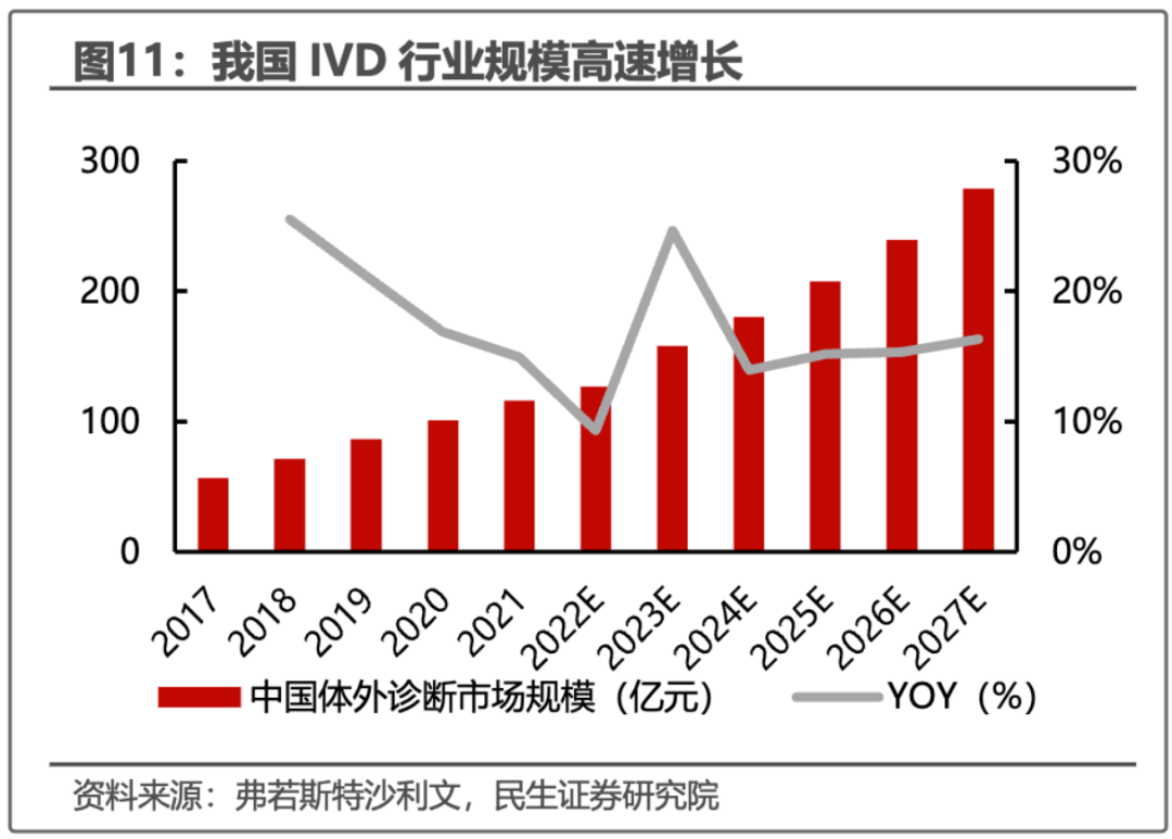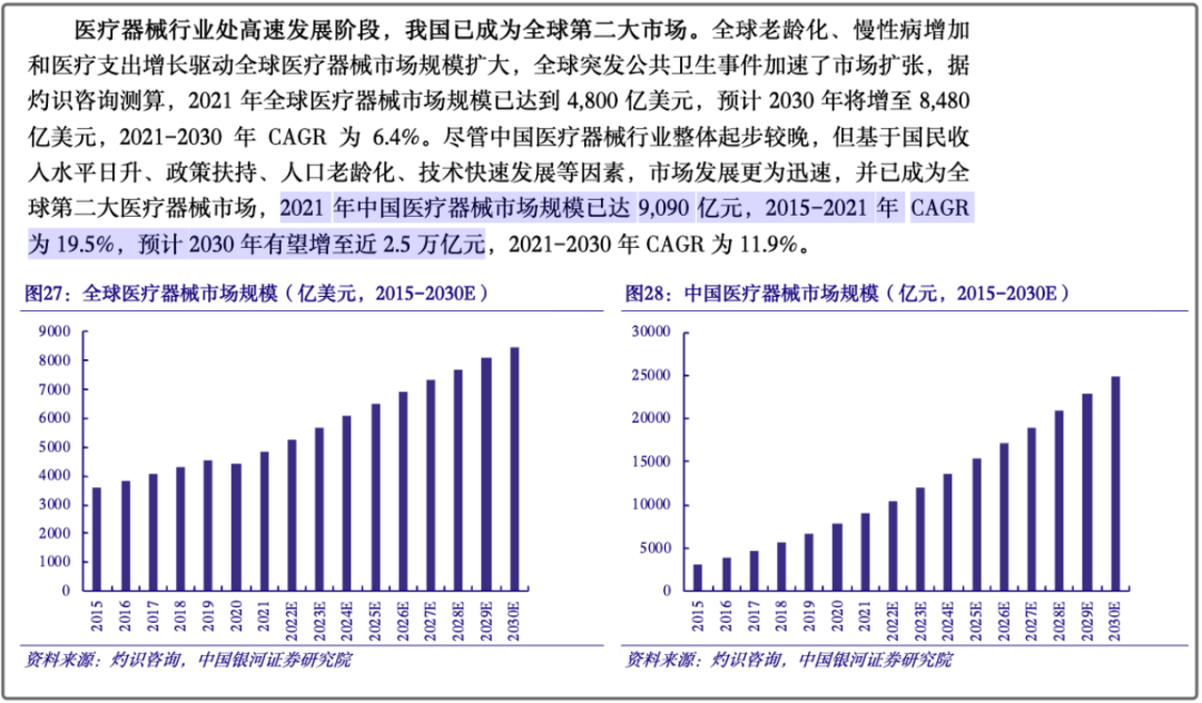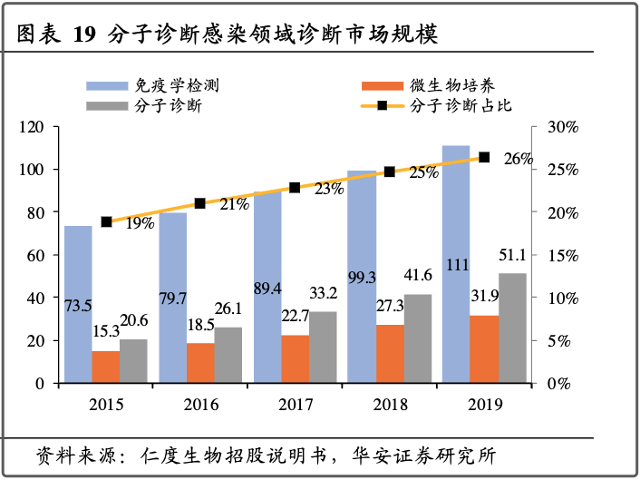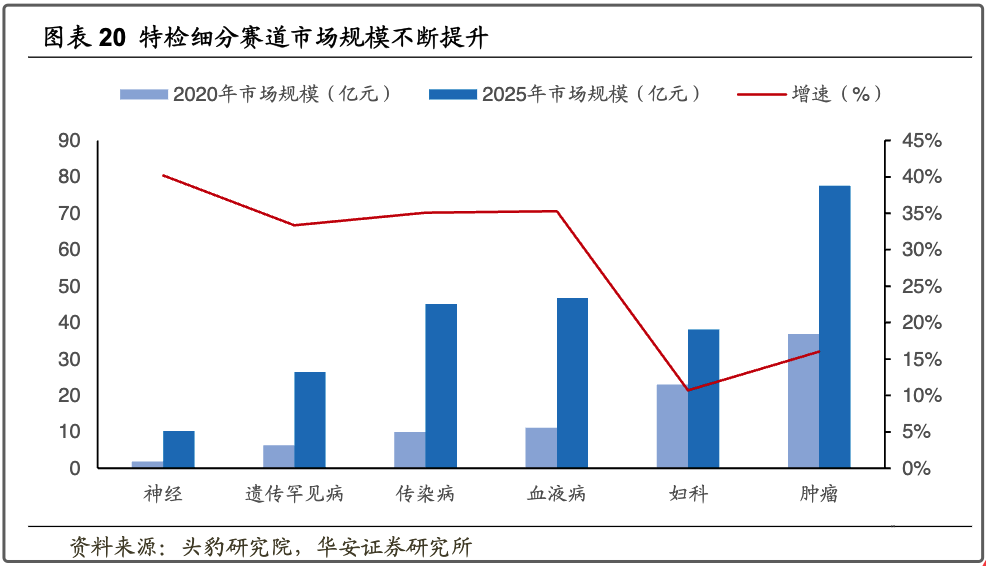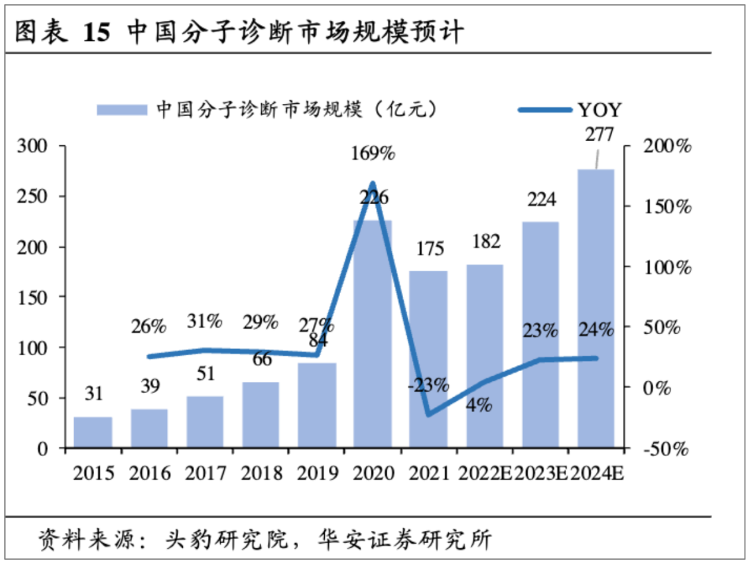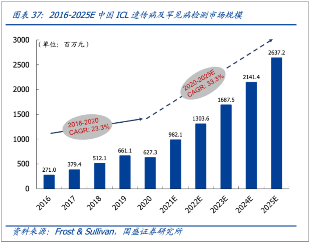 这些关于千亿市场规模的想象,少数被证实,大多被证伪。或者不能说“证伪”,只是前路漫漫,花开彼岸。“千亿市场”是如何被计算出来的?不同的人有不同的逻辑,不同的逻辑计算出来的市场规模往往差异巨大。谁最可信? 我们需要更多的交叉印证,估算出相对可信的规模数据。本文以常见的研报案例,一方面带大家了解方法论:常见市场规模的计算方法;另一方面,汇总一些研报数据,让大家对各赛道的市场规模,有个初步印象。市场规模(Market Size),即市场容量,市场规模主要是研究目标产品或行业的整体规模。企业在产业链上的角色不同,其测算市场规模的方式也不同,如,以终端价计、还是出厂价计。最终选择何种方法,要取决于测算的目的。根据产品的目标人群需求出发,测算目标市场规模。这是我们最常用的方法。NIPT市场规模 = 孕妇总数量 * NIPT渗透率 * NIPT单价中国NIPT市场的市场规模测算(国元证券,2020):(提示:2020的研报,预测数据与真实数据已有很大偏差,我们只关注计算逻辑,不关注具体数值,下同。)(1)孕妇总数量根据国家统计局每年披露的新生儿数值进行估算;(2)根据NIPT的临床检测路径,分为了“高龄孕妇”+“非高龄孕妇”,并分别赋予不同的“渗透率”;(3)NIPT单次检测价格来源官方物价或市场调研;但尽管逻辑合理,但我们也可以从这个案例中“马后炮式”的直观发现,关于“新生儿总数”的估计,大大超过了后续真实情况(1500w vs ~900w);仅此一项关键数据,市场规模的演算就会出现巨大偏差,NIPT渗透率、NIPT检测单价的预测,也会被这种偏差放大。这提示我们,重点关注当下规模和计算逻辑,审慎看待各种预测数据。这是来自另一行研公司关于NIPT的预测数据(2022年):其计算逻辑类似,但大家可以直观看到不同数据源所得出结果的巨大差异。市场总规模 = 细分市场1 + 细分市场2 + 细分市场3....(各细分市场的规模,可采用(1)需求渗透率分解法进行测算。)(1)基于NGS伴随诊断市场规模 = 肺癌NGS市场规模 + 胃癌NGS市场规模 + 肠癌....(2)肺癌伴随诊断市场规模 = 肺癌NGS市场规模 + 肺癌PCR市场规模 + 其他方法学... 中国常见癌种伴随诊断市场规模测算(国元证券,2020):根据癌种、方法学分别进行测算,然后根据需要,进行细分市场结果加和。其最终结果的准确性,要归因于单一细分市场规模的测算准确性。运用此方法测算市场规模,则需要测算者本人在本行业内从事相关工作多年、或经过详细的市场调研,这是对测算者的行业经验要求较高的一个方法。市场规模 = 某品牌的销售额 / 该品牌的市场份额。(其中,销售额往往已知,而市场份额多来源于经验或调研估算。)中国高通量测序仪年出货规模 = MGI年出货规模 / MGI市占率中国中低通量测序仪市场测算(头豹研究院,2024):中国中低通量测序仪市场规模 = [(MGI+Illumina+Thermo国内出货量)/三家合并市占率]*中低通量占比。在这个案例中,根据主要厂家的销售情况去测算总体市场规模,是一个相对准确的计算方式。结果可能的偏差,主要取决于主要厂家的信息披露是否完全,如下,赛默飞的基因测序仪营收,是通过类比测算,估算了一个比例:比如根据“需求渗透率分解法”得出的某一年度的NIPT市场规模,再根据“典型公司反推法”:华大、贝瑞等上市企业披露的数据、市占率推导出来的总市场规模,两种方法交叉印证。如两种方法测算结果近似,则数据可信度较高;如差异巨大,则要细究原因。了解了常见的市场规模测算方法,再来看看2023-2024年各研报中关于各种赛道的估算规模,由大到小:风险提示:股市有风险,投资需谨慎,以上内容仅供投资者参考,不作为投资决策的依据。