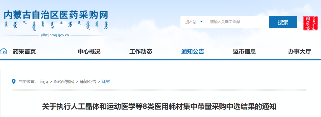 6月7日,内蒙古医保局发布通知,关于执行人工晶体和运动医学等8类医用耗材集中带量采购中选结果的通知。其中肾功心肌酶类生化试剂带量采购结果自2024年7月1日开始执行。
