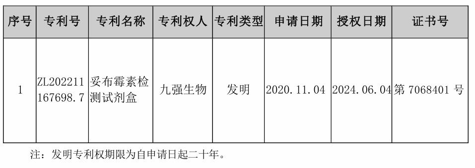 九强生物6月7日晚间公告,公司于近期收到中华人民共和国国家知识产权局颁发的1项专利证书,专利名称为妥布霉素检测试剂盒。 公告称,上述发明专利证书的取得有利于发挥公司的知识产权优势,促进技术创新,有利于提升公司的核心竞争力,有利于公司形成持续创新机制。 资料显示,九强生物作为国内体外诊断产业领军企业之一,致力打造最优体外诊断检测平台,目前拥有生化检测系统、血凝检测系统、发光检测系统、血型检测系统、病理检测系统和液体活检CTC。 2023年,公司实现营业总收入17.42亿元,同比增长15.27%;归母净利润5.24亿元,同比增长34.60%;基本每股收益为0.9元。公司2023年年度利润分配预案为:拟向全体股东每10股派2元(含税)。2024年第一季度,公司实现营业总收入3.94亿元,同比增长5.49%;归母净利润1.21亿元,同比增长8.67%。 |
