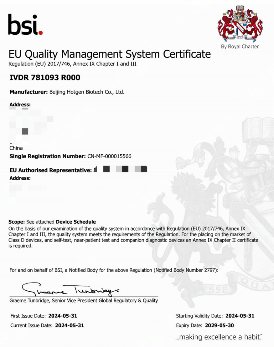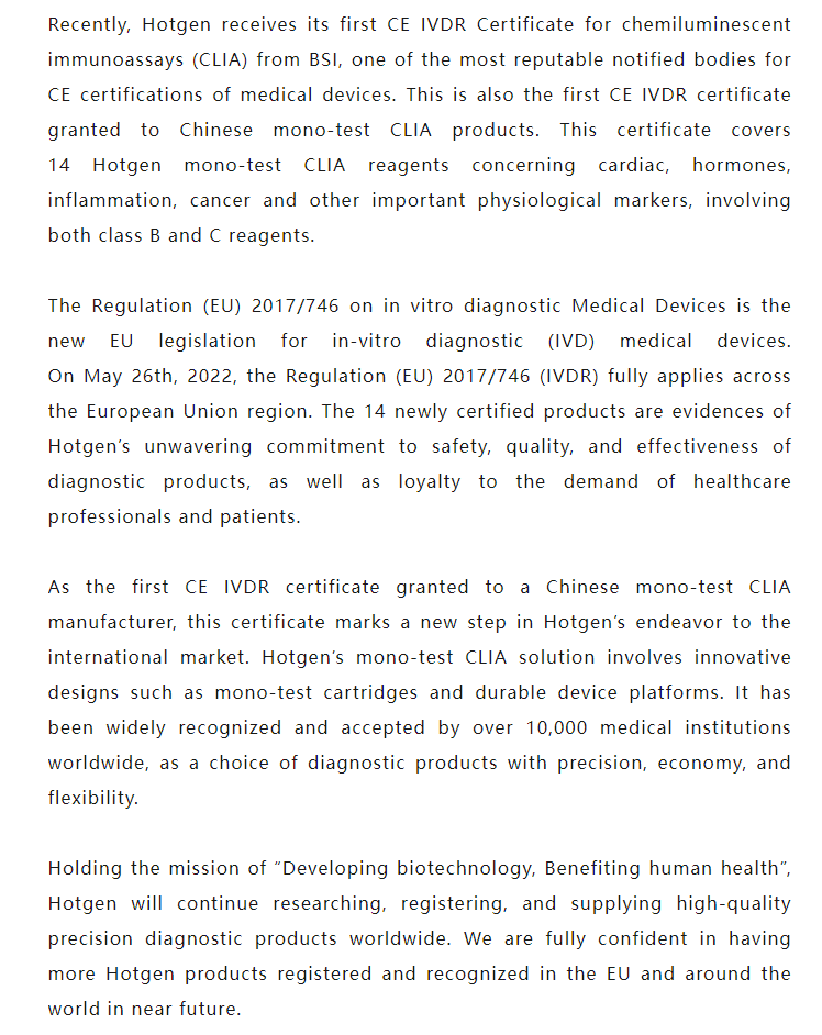 近日,热景生物成功获得了欧盟体外诊断医疗器械法规(IVDR)下的CE认证,跻身国内少数率先获得该标准认证的IVD厂商之列。这也是国内单人份化学发光类产品获得的首张CE IVDR证书,由欧洲最有声望的认证机构之一英国标准协会(BSI)颁发。这一里程碑式成就,不仅标志着热景生物的产品符合欧盟新法规的要求,获得了国际高法规要求市场的准入许可,更彰显了我国诊断试剂行业不断提升的国际竞争力。 热景生物首批获得CE IVDR认证的产品涵盖了心肌、炎症、激素、肿瘤等多个重要临床检测领域中的14个关键诊断指标。这些产品的成功认证得益于热景生物在研发、生产、质量控制等方面,与国际高水平标准接轨的不懈追求,也印证了热景生物创新诊断产品在全球市场领先的品牌认可度。 创新诊断,价值检验。展望未来,热景生物将继续秉承“发展生物科技,造福人类健康”的使命,坚持守正创新,持续提升产品竞争力,为广大患者和医疗机构提供更多优质诊断试剂和解决方案,推动我国诊断试剂行业迈向更高峰,为全球医疗事业贡献中国力量。让我们共同期待,我国诊断试剂行业在国际舞台上绽放更加耀眼的光芒,为全球大众健康福祉带来更大贡献! |