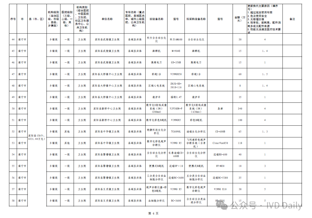 刚刚,广西卫生健康委发布2024年县域医共体设备更新项目可行性研究报告。 本次设备更新规模和计划如下: 根据广西全区目前医疗工作需要,本项目为以旧换新项目,报废设备1292台。 项目总投资7.05亿。其中购置CT、DR、彩超、全自动生化分析仪、血液分析仪、电解质分析仪、尿液分析仪其他等设备7.05亿。 项目资金来源:申请超长期特别国债5亿元;市县配套资金及单位自筹2.05亿元。 项目实施进度期为2024年6月-2024年12月,共计6个月: 2024年7月-完成项目可研报告编制和批复工作; 2024年7月-9月,完成项目招投标工作; 2024年9月-12月,完成设备安装交付验收工作。 规划政策符合性 《中华人民共和国国民经济和社会发展第十四个五年规划和2035年远景目标纲要》 本项目的建设地处于广西壮族自治区,旨在促进国家公共卫生发展,紧跟国家2035年远景目标规划, 为广西人民提供全方位全生命期健康服务。 《高举中国特色社会主义伟大旗恢为全面建设社会主义现代化国家而团结奋斗》 日前广西省医疗卫生资源总量不足、布局不均、整合不够等问题依然存在。本项目建设能够促进广西省优质医疗资源扩容和区域均衡布局。为广西人民健康安全保驾护航。 《"十四五" 优质高效医疗卫生服务体系建设实施方案》 本项目建设能够努力让广大人民群众就近亨有公平可及、系统连续的高质量医疗卫生服务, 为广西人民健康安全保驾护航。 《公立医院高质量发展促进行动 (2021-2025年)》 综上,本项目是按照落实(中华人民共和国国民经济和社会发展第十四个五年规划和 2035 年远景目标纲要) 《高举中国特色社会主义伟大旗帜为全面建设社会主义现代化国家而团结奋斗》 《"十四五" 优质高效医疗卫生服务体系建设实施方案》《公立医院高质量发展促进行动 (2021-2025年)》纲领性文件的切实行动,是落实完善公共卫生服务具体表现,符合经济社会发展规划。 附件:(节选)广西医疗卫生领域2024年设备更新需求表: 来源:广西卫生健康委、IVD Daily、IVD联盟。 |