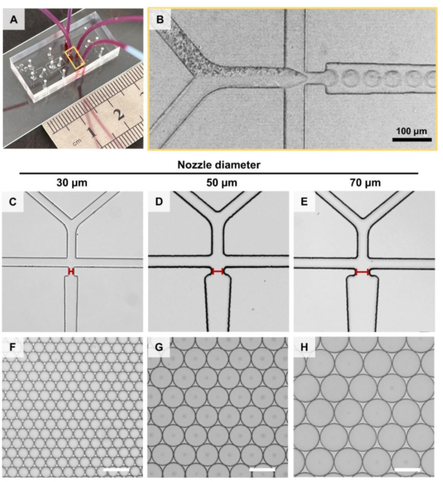 下图为微流控芯片图片,微流控芯片不同喷嘴的显微镜图像,微流控芯片液滴的显微镜图像。(A)微流控芯片制备液滴的图片。(B)放大(A)中黄色框的部分。(C)喷嘴为30 μm, (D)喷嘴为50 μm, (E)喷嘴为70 μm的微流控芯片显微镜图像。不同喷嘴大小(F) 30 μm、(G) 50 μm、(H) 70 μm的芯片产生液滴的显微镜图像。比例尺:100 μm。