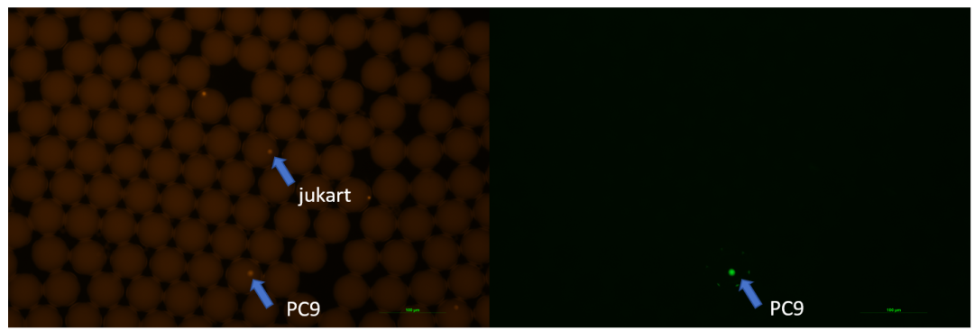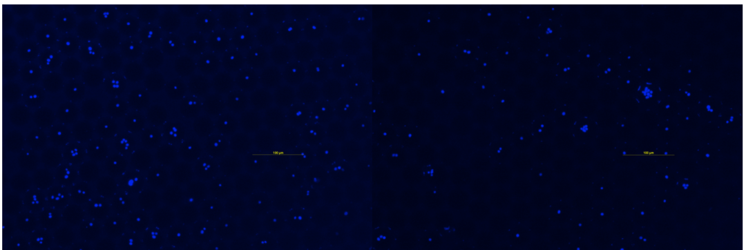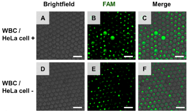 下图为,荧光显微镜下观察dPCR液滴包裹细胞情况。