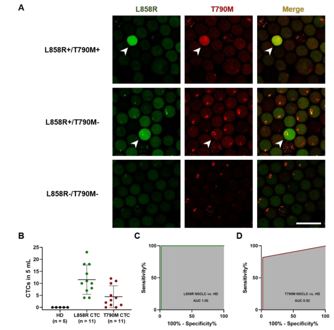 为了评估数字化CTC定量法检测临床肿瘤患者外周血中EGFR T790M耐药CTC的能力,作者检测了11例接受TKI治疗的NSCLC患者(组织测序证实EGFR L858R突变)的外周血CTC。11例NSCLC患者中,6例EGFR T790M突变,5例无T790M突变。采用两组针对EGFR L858R和T790M突变位点的引物检测CTC。当检测到EGFR L858R突变阳性时,证实存在CTC。此外,微滴中EGFR L858R和EGFR T790M同时阳性的检测表明存在携带EGFR T790M突变的CTC。100%的NSCLC患者检出携带L858R突变的CTC (≥1个/5 mL)。在100%的有T790M突变的NSCLC患者(6 / 6)和60%的无T790M突变的患者(3 /5)中检测到携带T790M突变的CTC (≥1个CTC /5 mL),而在健康供者中未检测到CTC。