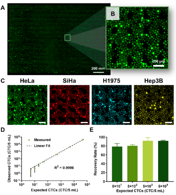 健康人外周血样本5 mL,加入不同数量的HeLa、SiHa、H1975和Hep3B细胞(5、10、20、50、500、5000和50 000个细胞),形成一系列模拟癌症患者外周血浓度。用红细胞裂解缓冲液裂解模拟样本中的红细胞后,用100 μL悬浮溶液重悬剩余细胞。随后,将细胞悬液、细胞裂解液和PCR试剂包裹在微流控通道内的20万个液滴中。与加标细胞数相对应,当液滴总数为20万时,每个液滴中的CTC数量仍服从泊松分布。由于液滴数量较多,作者专门设计了液滴阅读器,将放大后的液滴装入阅读器中进行显微镜记录。收集500多张显微镜图像后,将其组装成一张大图,通过软件(CellProfiler;下图a−C)。使用阳性液滴数和总液滴数结合泊松分布计算每个样本中的CTC数量。结果表明,检测的CTCs数量与预期附加值呈正相关,HeLa细胞、SiHa细胞、H1975细胞、Hep3B细胞的相关系数(R2)分别为0.9998、0.9999、0.9996、0.9997(下图D)。