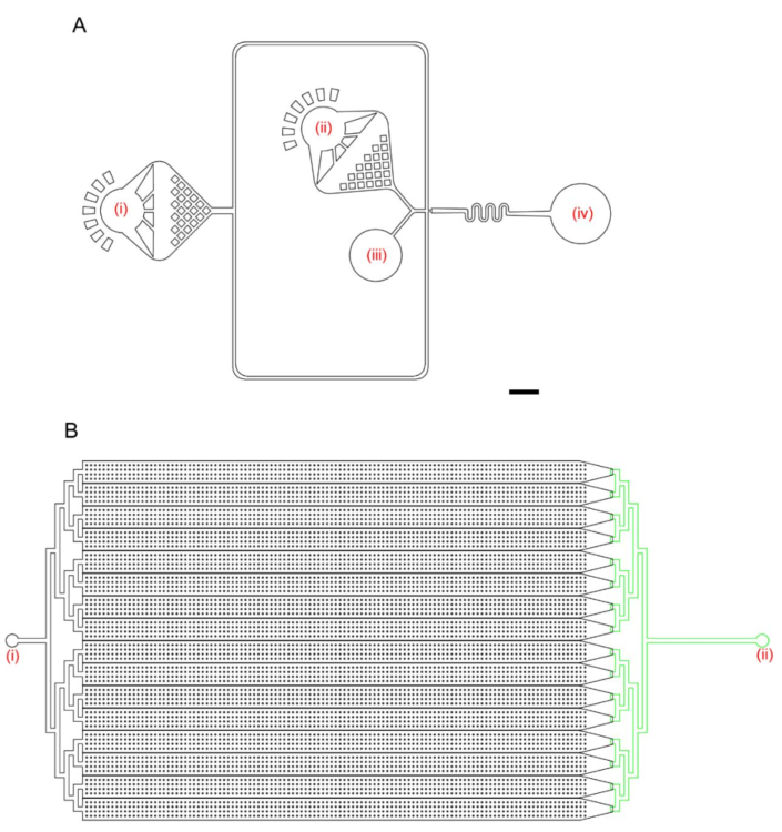 (A)液滴发生器的设计。这些数字表示载体油入口(i)、PCR混合入口(ii)、细胞悬浮入口(iii)和液滴收集出口(iv)。微流控通道的深度为50 μm。比例尺:500 μm。(B)液滴阅读器的设计。数字表示液滴入口(i)和油出口(ii)。黑色微流体通道的深度为70 μm,绿色通道为30 μm。比例尺:2000 μm。
