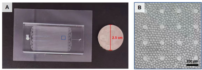 液滴读取器芯片图片和充满液滴的液滴读取器芯片的一部分显微镜图像。(A)液滴读取器芯片图片。(B)充满液滴的液滴读取芯片的一部分显微镜图像。